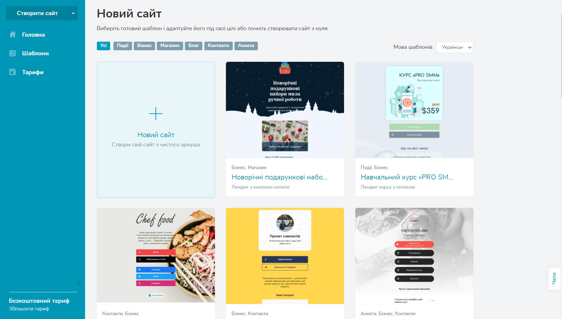 Weblium — конструктор сайтів з безкоштовним базовим тарифом, у якому є понад 300 шаблонів, необмежене сховище даних та SSL-сертифікат. Інтеграція з Google Analytics, відсутність реклами та індексація пошуковими системами доступні у тарифі Pro за 399 грн на місяць.