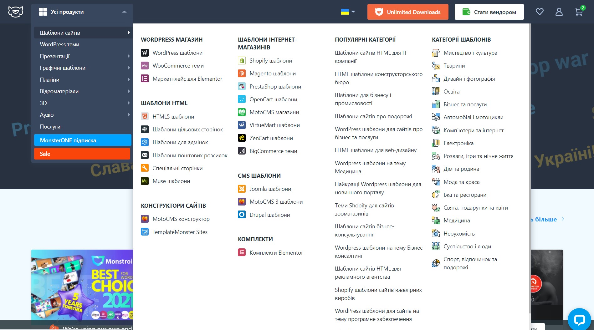 TemplateMonster — це маркетплейс, де можна знайти все, що треба для швидкого запуску власного продукту: шаблони вебсайтів, WordPress-теми, ілюстрації, шрифти, шаблони логотипів та інше. Вартість ліцензії на одноразове використання шаблону сайту — від $5.