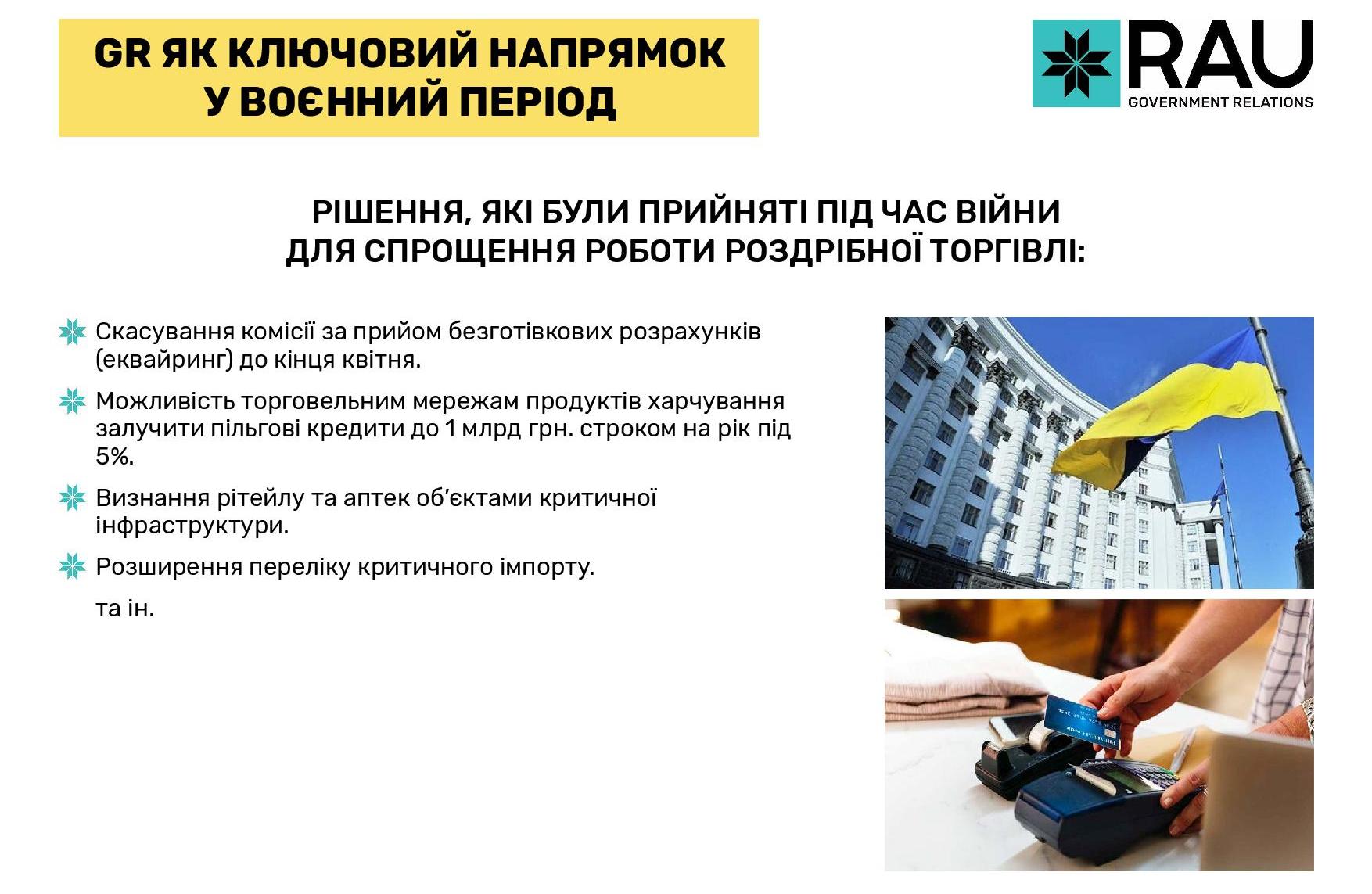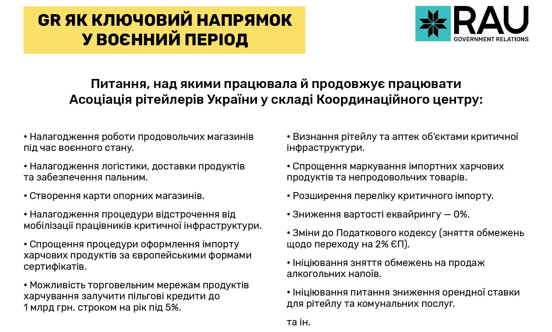 Серед основних рішень, які спростили роботу рітейлу у цей період — зниження вартості комісії за еквайринг до 0%, визнання рітейлу та аптек об’єктами критичної інфраструктури та розширення переліку критичного імпорту. Всі вони були ініційовані Асоціацією рітейлерів України.