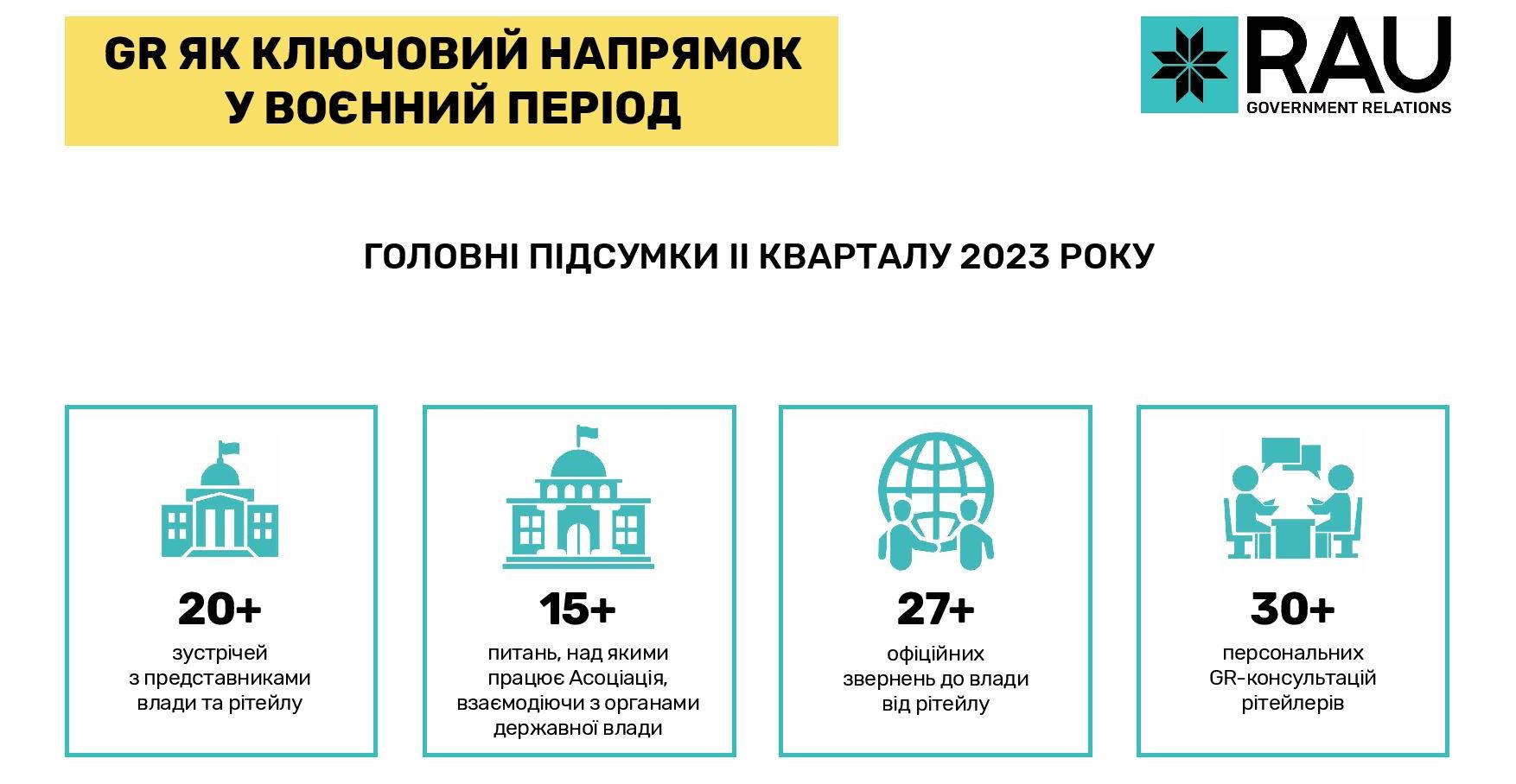 Підсумки роботи Асоціації рітейлерів України у ІI кварталі 2023 року в цифрах та графіках: які члени та партнери приєднались до RAU, скільки статей було опубліковано, які зустрічі з владою організувала GR-команда, що було зроблено та які результати отримано.