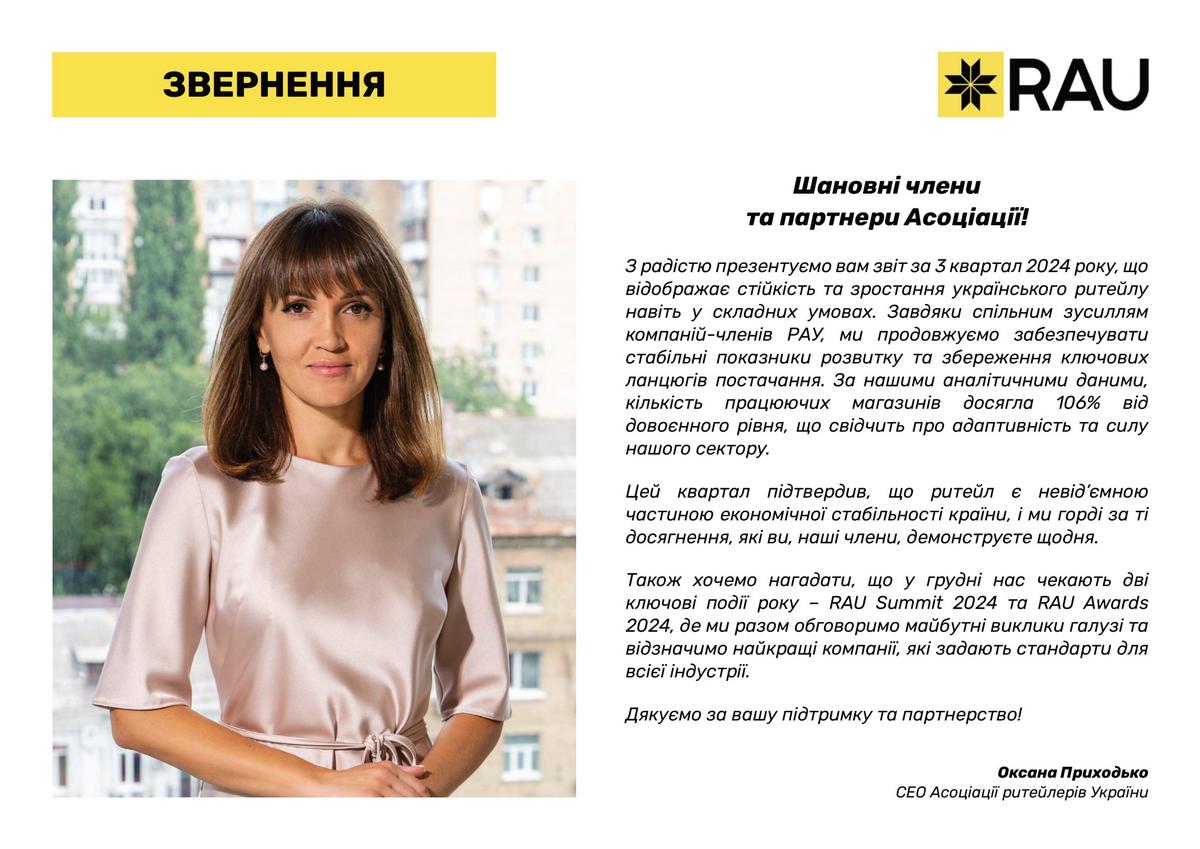 Оксана Приходько, СЕО Асоціації ритейлерів України: «З радістю презентуємо вам звіт за III квартал 2024 року, що відображає стійкість та зростання українського ритейлу навіть у складних умовах. Завдяки спільним зусиллям компаній-членів RAU, ми продовжуємо забезпечувати стабільні показники розвитку та збереження ключових ланцюгів постачання. За нашими аналітичними даними, кількість працюючих магазинів досягла 106% від довоєнного рівня, що свідчить про адаптивність та силу нашого сектору.
