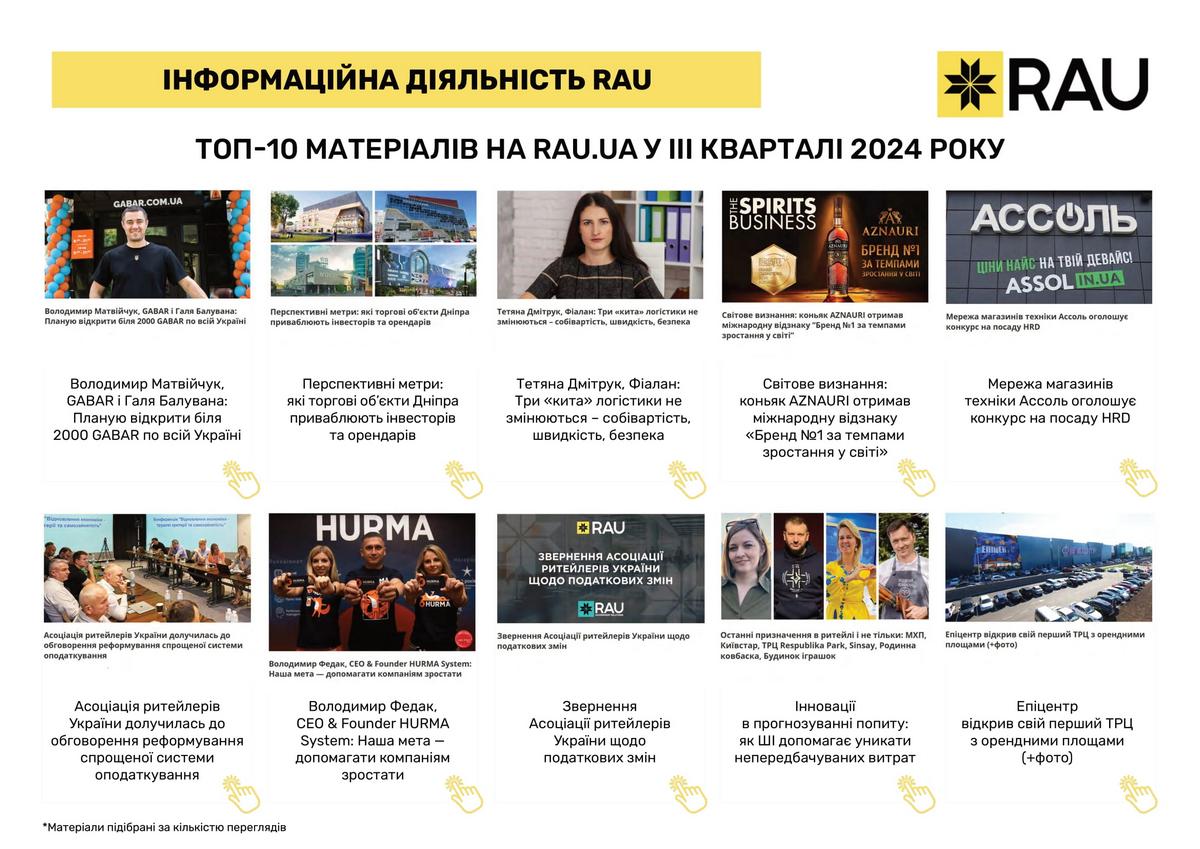 Підсумки роботи Асоціації ритейлерів України у IIІ кварталі 2024 року в цифрах та графіках: які члени та партнери приєднались до RAU, скільки статей було опубліковано, які аналітичні дослідження вдалося реалізувати, які зустрічі з владою організувала GR-команда, що було зроблено та які результати отримано.