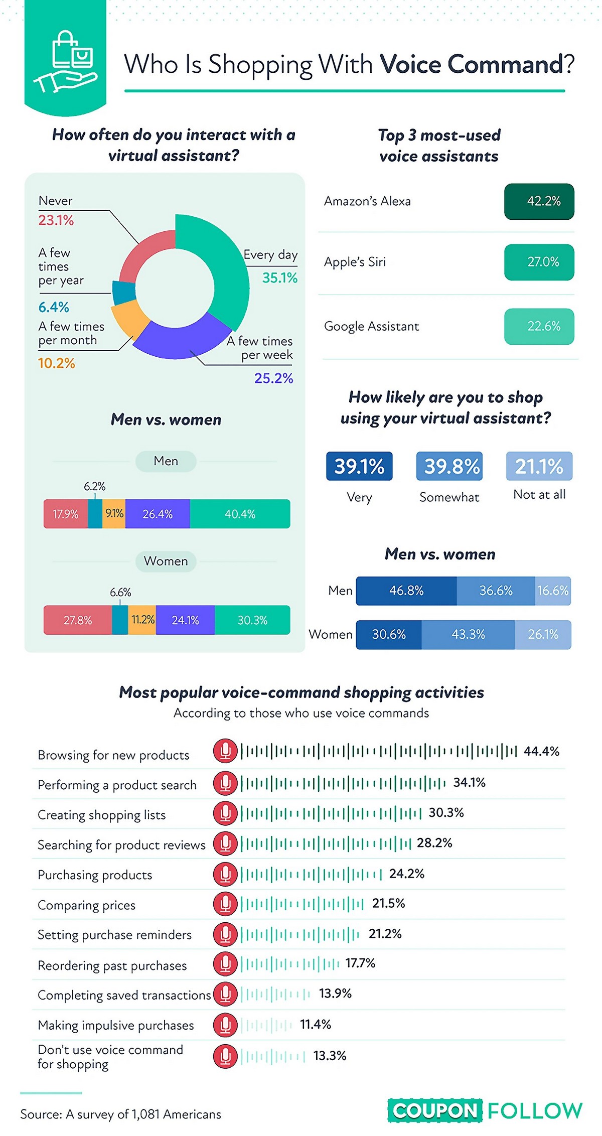 Опрос 2021 года показал, что почти 40% владельцев умных динамиков в значительной степени склонны консультироваться со своим помощником при совершении покупок. Они делают все от пересмотра новых продуктов до создания списков покупок и фактической покупки товаров. Голосовые покупки более популярны среди мужчин, чем среди женщин.