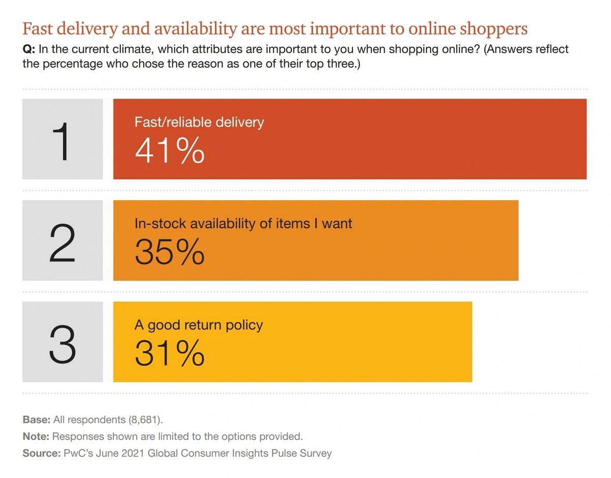 Опрос PwC показал, что 41% покупателей по всему миру считают быструю и надежную доставку одним из трех наиболее важных факторов при совершении покупок в интернете.