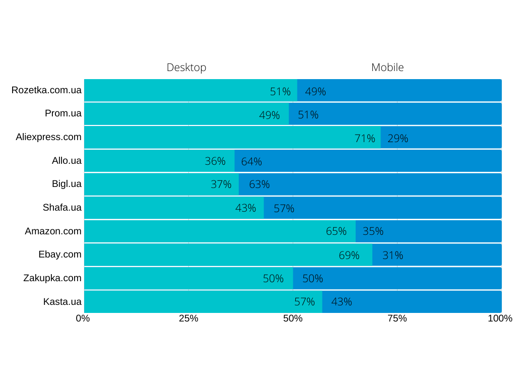 Какие украинские маркетплейсы были самыми посещаемыми, с каких устройств чаще всего заходили их пользователи, сколько длился сеанс и как много страниц в среднем просматривали онлайн-пользователи в январе 2020 года.