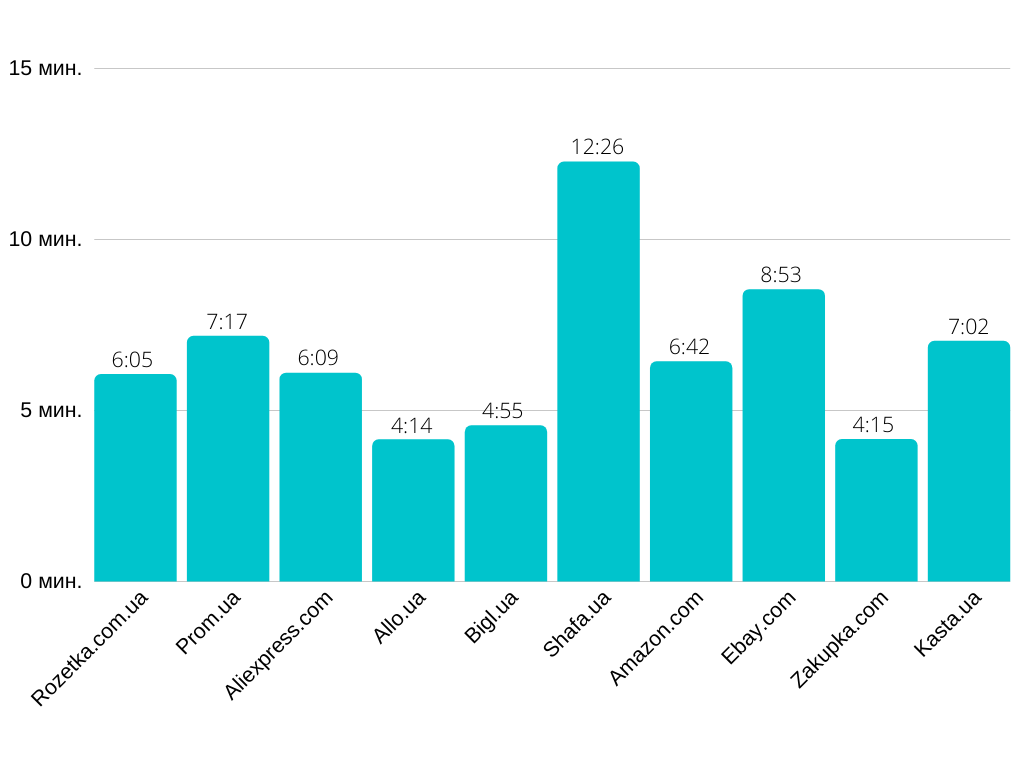 Больше всего времени пользователи проводили на сайте Shafa.ua— 12 минут за сеанс. Это сопоставимо с показателями соцсетей. Например, сеанс на веб-версии Facebook в среднем длится 11 минут.