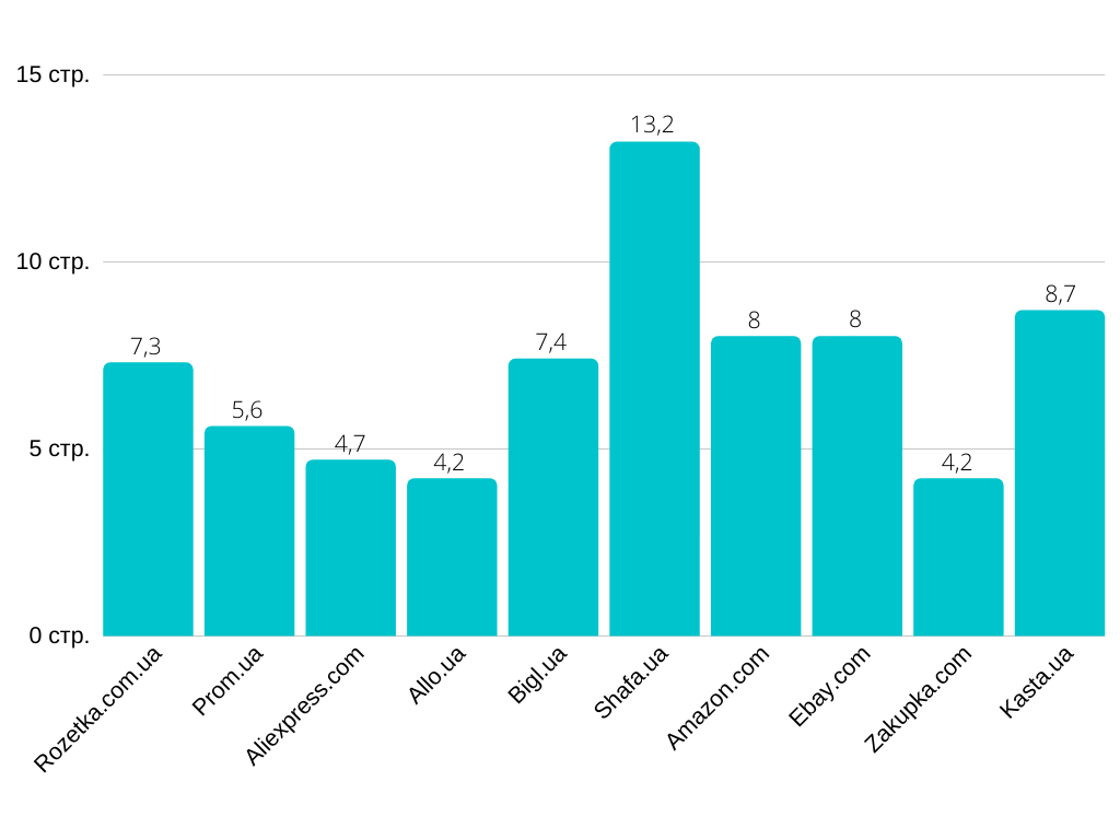 Рекордсмен по числу просмотренных за раз страниц — сайт Shafa.ua. Это связано со спецификой маркетплейса — на нем пользователи не всегда ищут конкретный товар, а присматривают варианты доступных брендовых вещей.