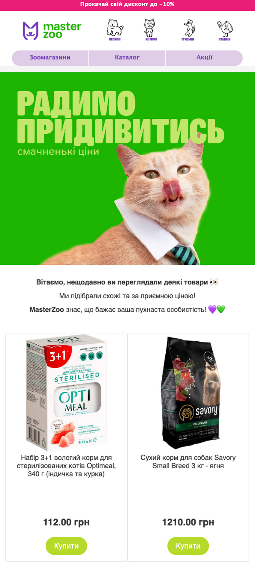- пользователям, которые интересовались товарами менее чем за 1000 грн — сообщение без промокода, но со ссылкой на самый дорогой продукт.