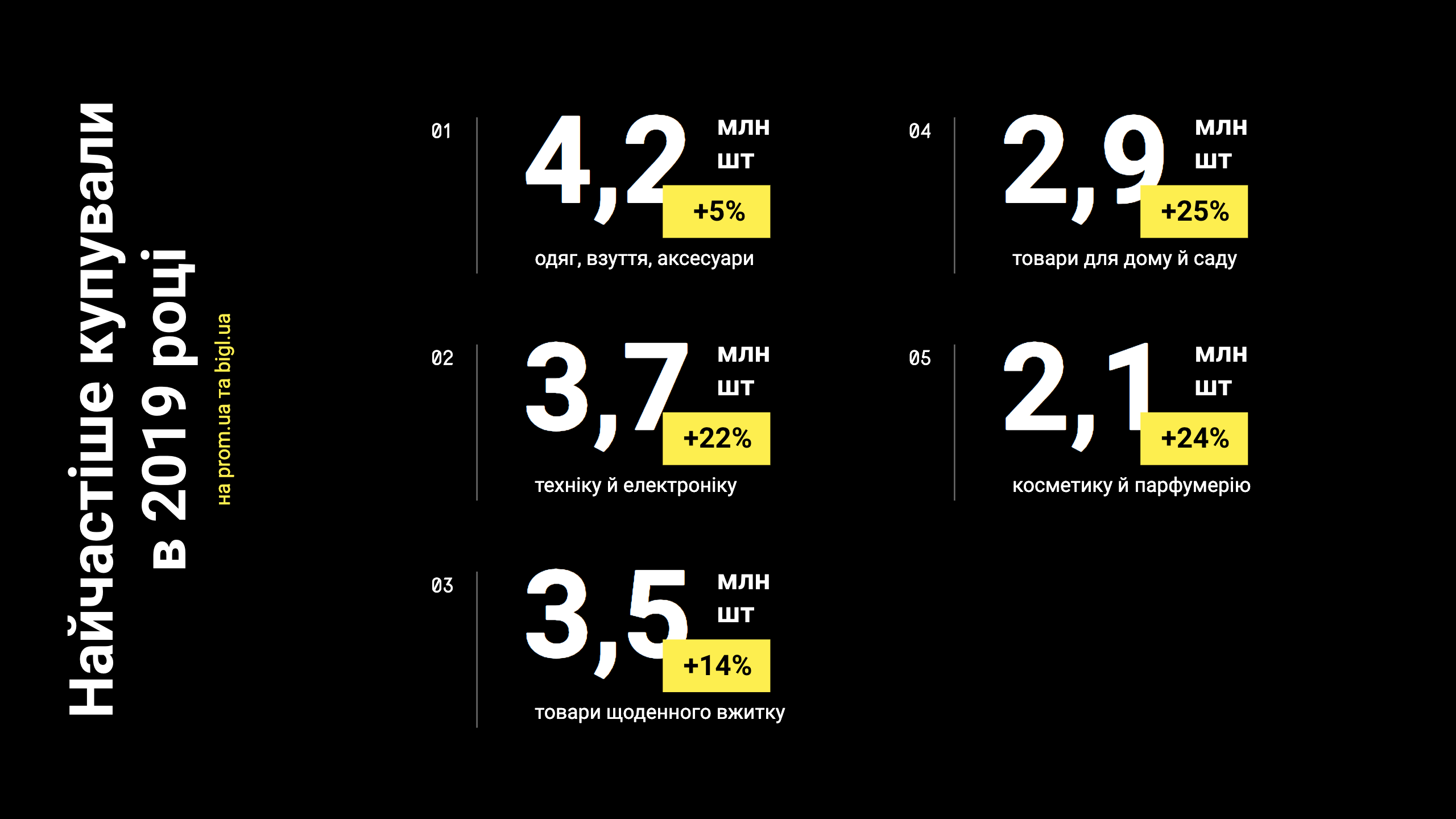 Чаще всего в 2019 году онлайн украинцы покупали одежду и обувь, технику и электронику, товары повседневного спроса, косметику и парфюмерию. В то же время быстро растет спрос на товары для дома, книги, товары для хобби и для автомобилей.