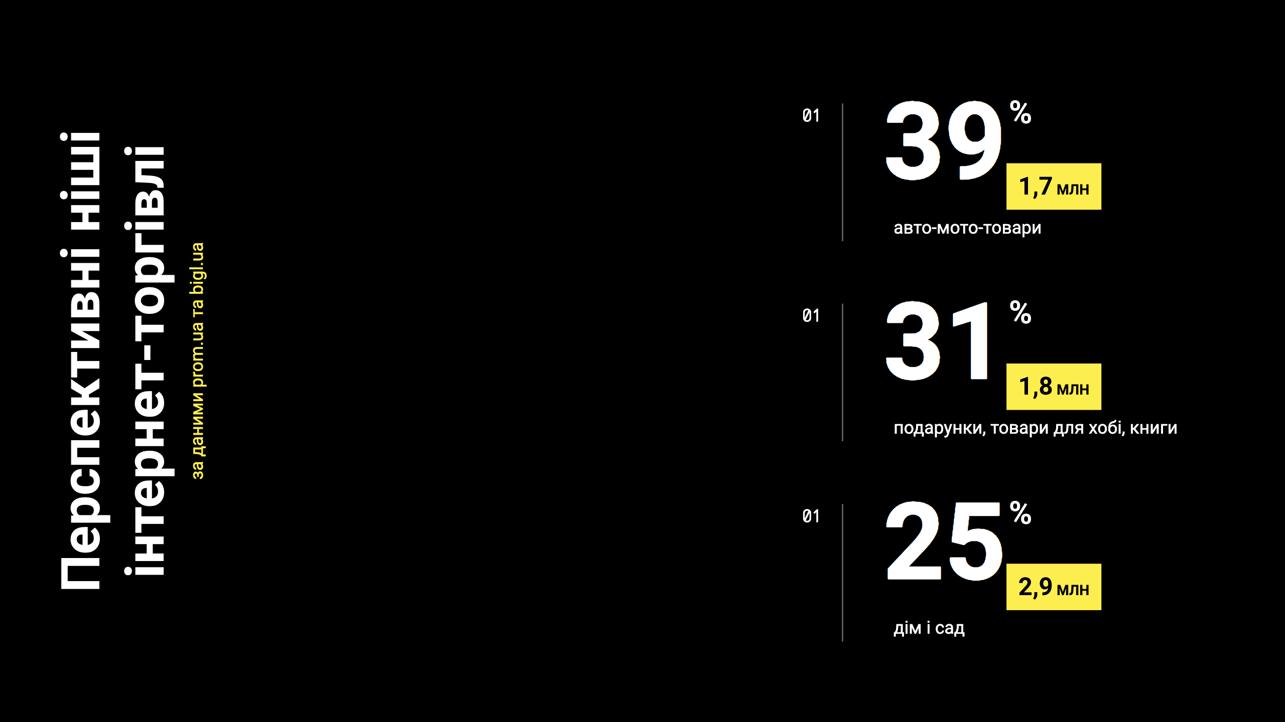 Так, согласно данным prom.ua и bigl.ua наиболее перспективной нишей выглядит торговля авто-мототоварами – прирост за год 39%. На втором месте – подарки, книги и товары для хобби, которые прибавили за этот период 31%. Наконец замыкает тройку лучших по темпам роста товары для дома и сада с показателем + 25%.