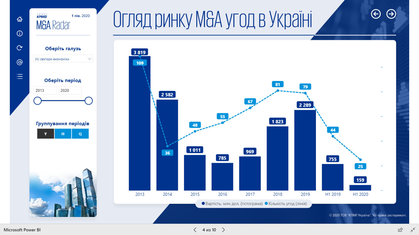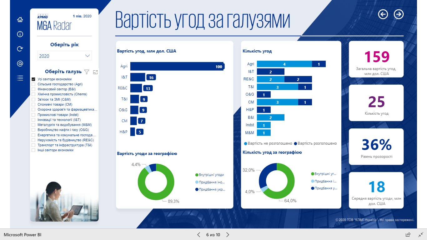 По данным нового исследования KPMG «Радар M&A в Украине за I полугодие 2020 года» экономический спад, вызванный вспышкой вируса, привел к значительному падению рынка M&A в Украине за этот период. За шесть месяцев было заключено 25 сделок, что на 43% меньше, чем аналогичный показатель 2019 года. По сравнению с 2015 годом стоимость сделок упала на 79% – до $159 млн.