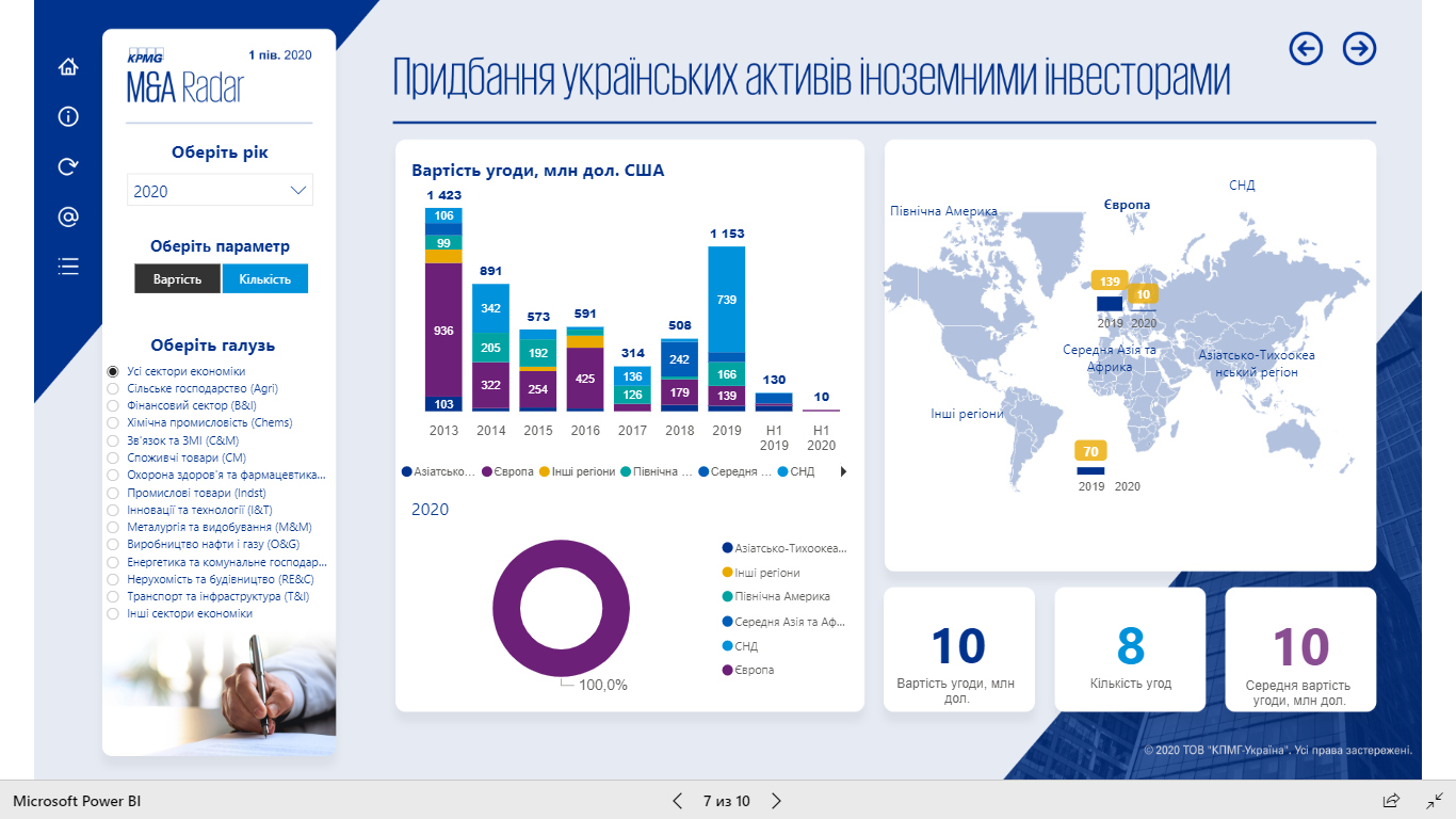 «Во второй половине 2020 года активность на рынке M&A будет оставаться невысокой, поскольку покупатели и продавцы сосредоточены на сохранении своего бизнеса и избежании разрушительных последствий пандемии. В Украине падение ВВП ожидается на уровне 8%, и рынок M&A, естественно, будет испытывать влияния ухудшения ситуации в экономике. Однако в целом наши ожидания в среднесрочной перспективе остаются оптимистичными», – сказала Светлана Щербатюк, КPMG в Украине.