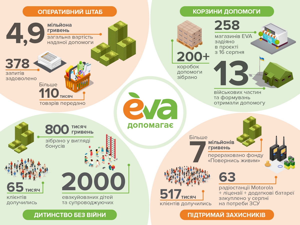 Оперативный штаб, организованный в EVA 26 февраля, уже удовлетворил 378 запросов на гуманитарную и социальную помощь из 140 городов по всей Украине. По обращениям представителей ВСУ, волонтерских и общественных организаций на 31 августа передано более 110 000 единиц необходимых товаров на сумму более 4,9 млн грн.
