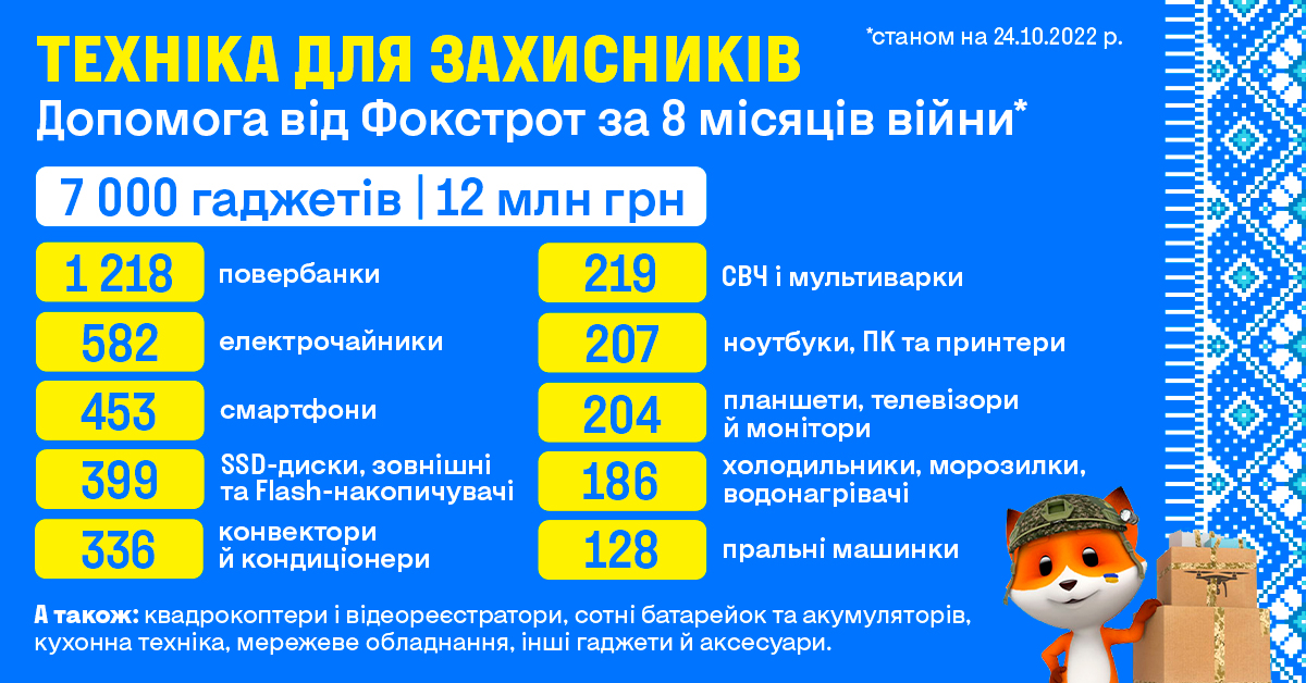 За это время Фокстрот передал защитникам Украины и представителям волонтерских организаций 7000 электронных гаджетов, бытовой техники, разнообразных аксессуаров на общую сумму 12 миллионов гривен. Участие в организации помощи принимают и покупатели сети, ведь социальный бюджет компании формируется в том числе из отчислений по продажам в розничных магазинах и интернет-магазине foxtrot.ua.