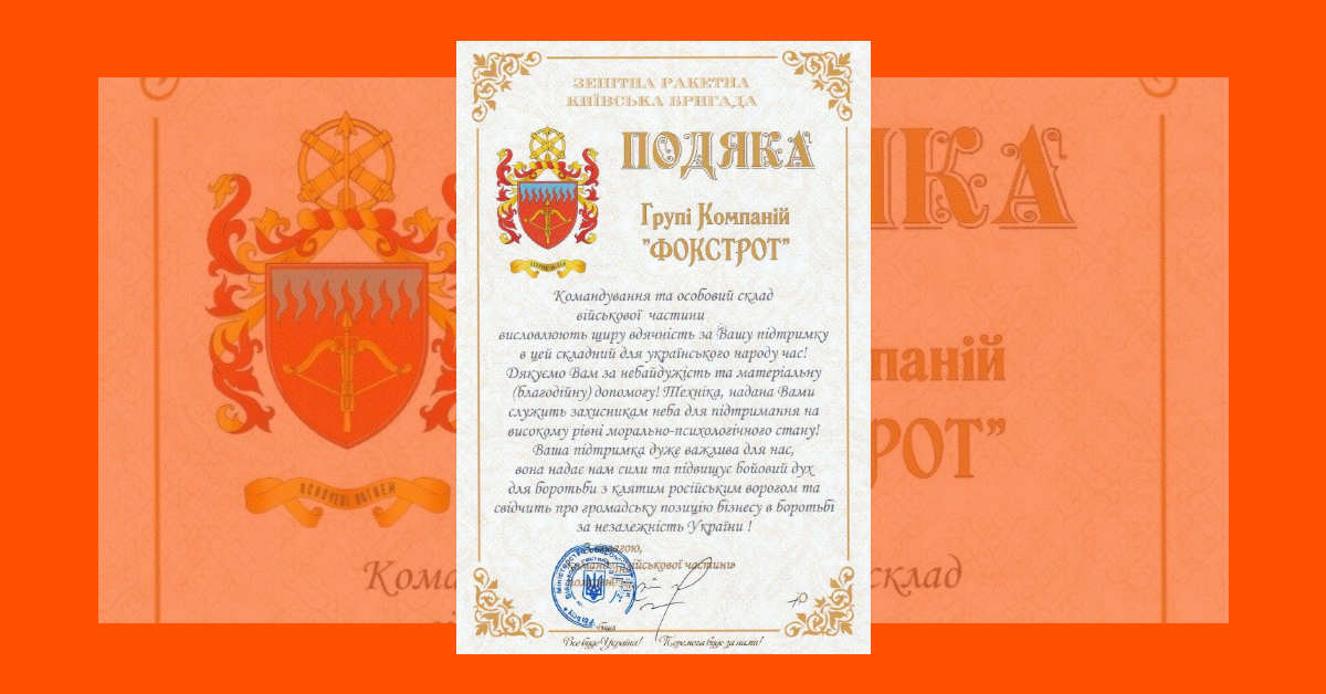«Командование и личный состав воинской части выражают искреннюю благодарность за вашу поддержку в это сложное для украинского народа время. Спасибо за неравнодушие и благотворительную помощь. Предоставленная вами техника служит защитникам неба для поддержания на высоком уровне морально-психологического состояния. Ваша поддержка очень важна для нас, она придает нам силы и повышает боевой дух для борьбы с проклятым российским врагом и свидетельствует о гражданской позиции бизнеса в борьбе за независимость Украины, – с такими словами благодарности обратился к Фокстрот командир одной из воинских частей зенитной ракетной Киевской бригады.