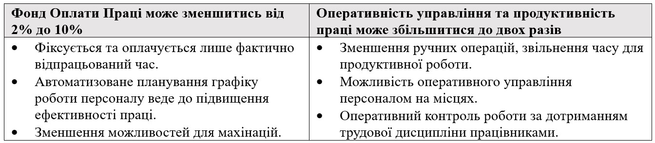 Использование TimeStaff ведет за собой прозрачность учета рабочего времени работников, прозрачность начисления заработной платы на основе достоверных данных о фактически отработанном времени и, как следствие, значительной экономии средств сети.