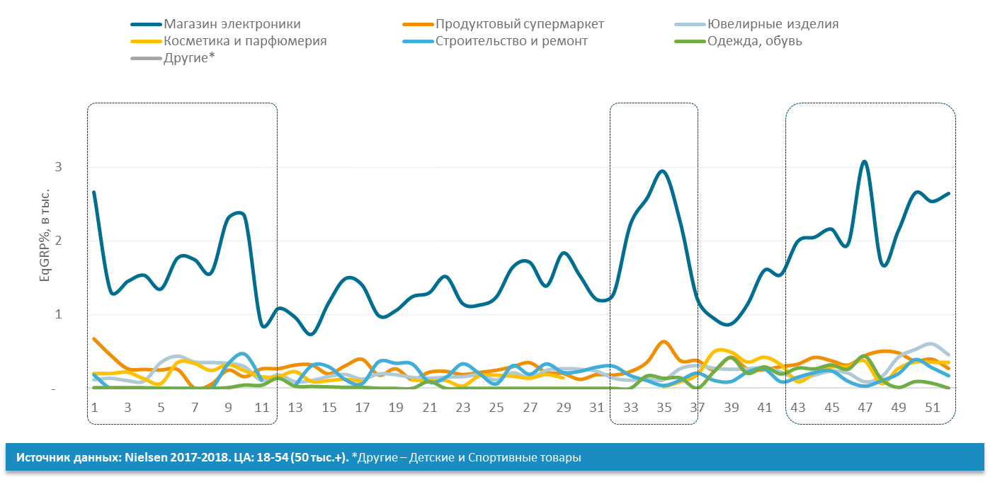 Также есть ряд тактических решений ритейлеров, таких как выбор прямой рекламы или спонсорства, выход на каналах альянса или группы 1+1, недельный вес, используемые хронометражи роликов и прочее.