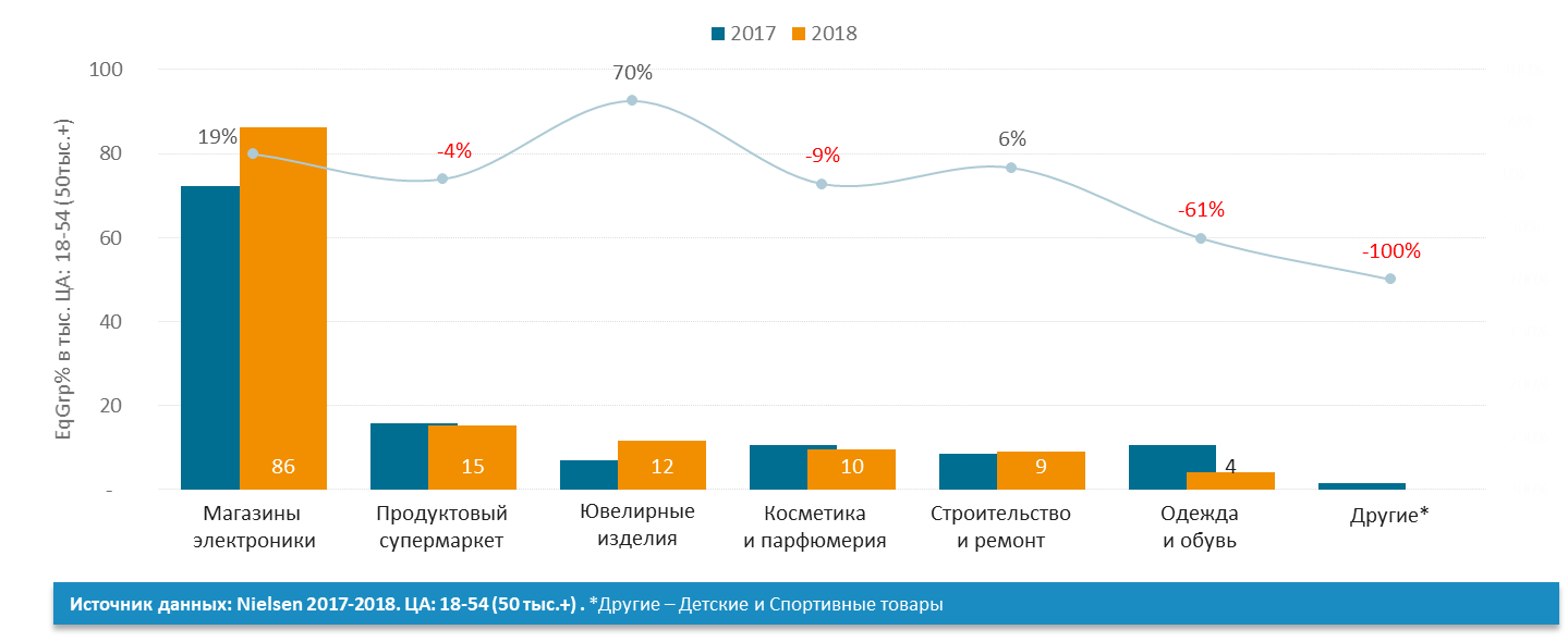 В 2018 году активность ритейлеров на ТВ выросла на 8% в объемах купленных рейтингов. Если говорить о бюджетах, то, с учетом роста цен на ТВ-рекламу, вложения выросли на 30% и более.