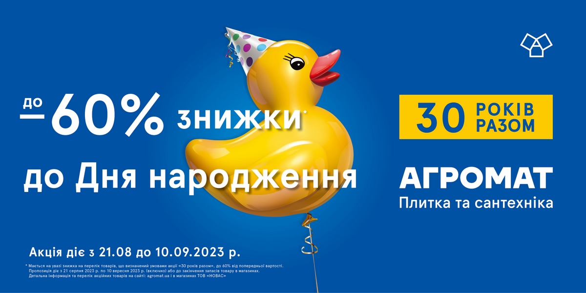 Ко дню рождения компании Агромат предлагает скидки до 60% на товары для ремонта дома, действующие по всей сети в Украине с 21 августа по 10 сентября 2023 года. Все товары со скидкой к 30-летию можно найти на сайте https://www.agromat.ua/ или посетить магазины сети.