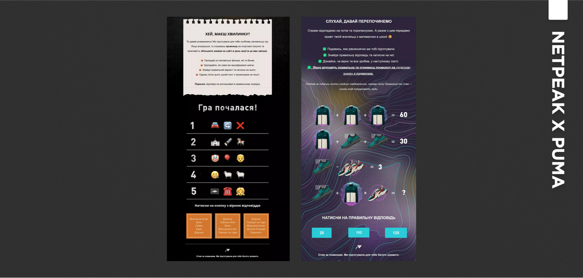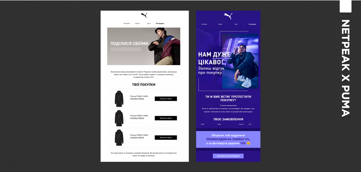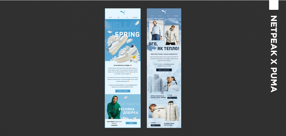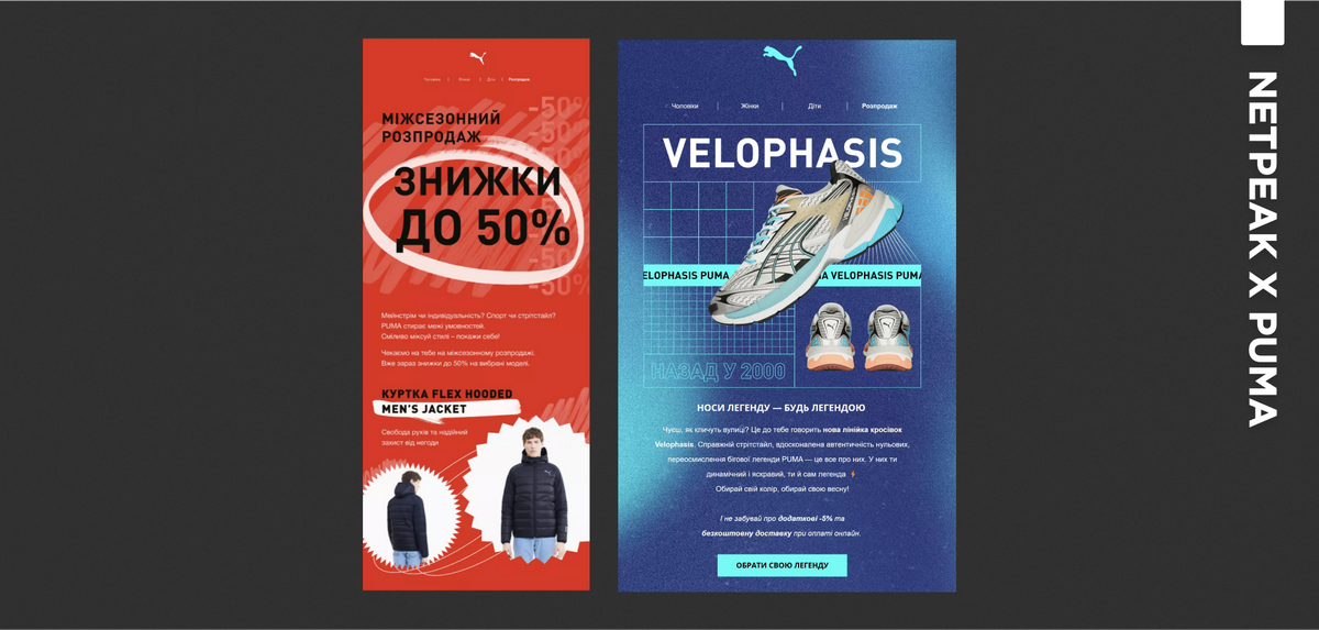 Вместе с командой Puma мы преследовали цель создать нечто стильное, привлекательное, что понравится аудитории и еще больше влюбит в бренд. Да, мы разработали единый концепт письма с общим стилем, а его наполнение и дизайн адаптировали в зависимости от темы рассылок.
