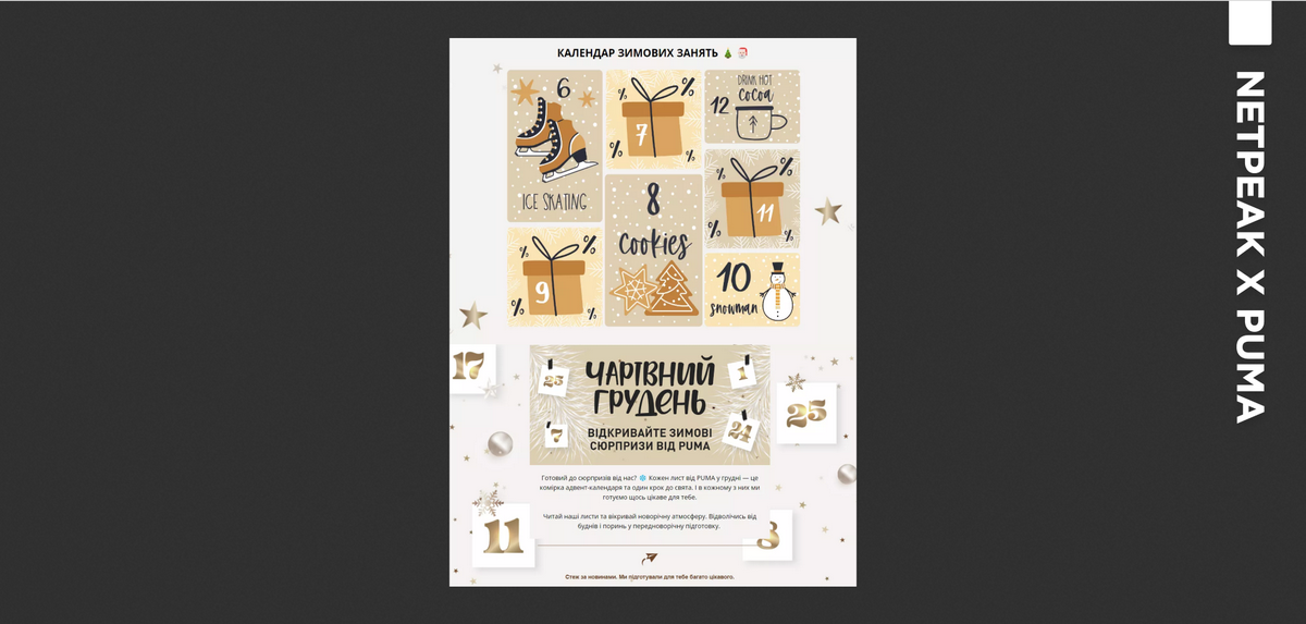 В рамках этого формата пользователи сайта Puma получили серию рассылок с полезным контентом: рекомендации по праздничным активностям, гиды по выбору подарков и интерактивные элементы, такие как выбор новогоднего шара на елке с персонализированными пожеланиями. Чтобы избежать банальных поздравлений с Новым годом, 31 декабря выпустили развлекательную игру, где подписчики выбирали, кто они в этом Новом году, а в начале каждого письма их ждали приятные предсказания.