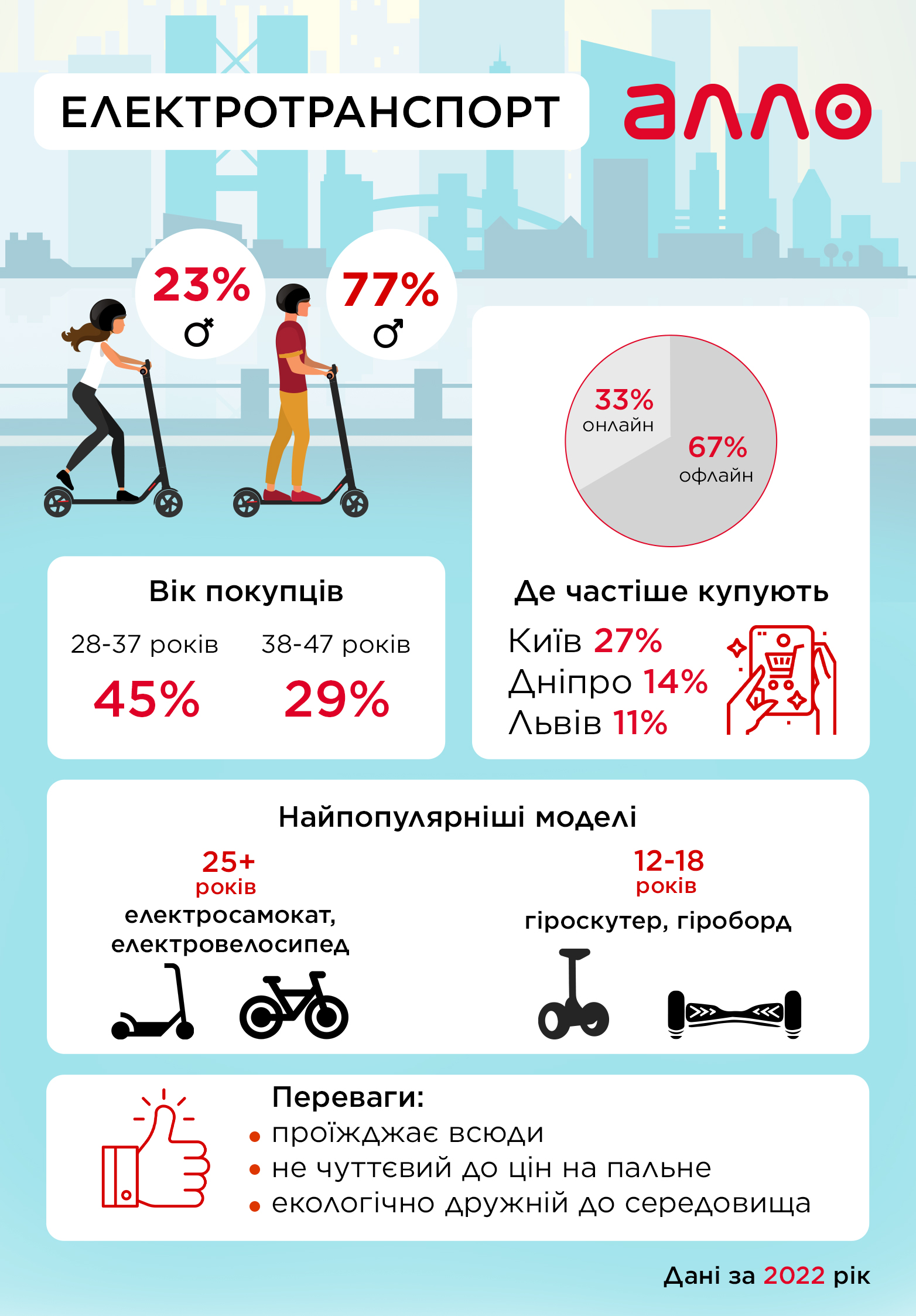 «Несмотря на военные действия в стране и падение покупательной способности, спрос на электротранспорт вырастет и в этом году. Ведь стоимость горючего не снижается, а с 1 июля возвращается НДС на топливо в размере 20%. Владельцы электротранспорта всегда чувствуют себя свободно: они проезжают где угодно, не зависят от высоких цен на горючее и не причиняют никакого вреда окружающей среде. Разветвленная сеть пунктов несокрушимости, в том числе и в большинстве магазинов Алло, поможет владельцам электросамокатов и гироскутеров подзарядиться в случае очередных атак на энергетическую инфраструктуру страны. Импорт электротранспорта налажен, и сейчас товар есть на рынке, включая новинки 2023 года», – комментирует директор по маркетингу Алло Артур Матковский.