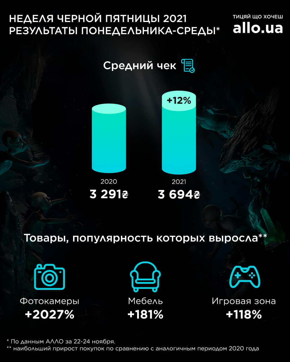 - Выросла средняя стоимость корзины в Алло на 12% по сравнению с такими же днями акции в прошлом году – до 3694 гривень.