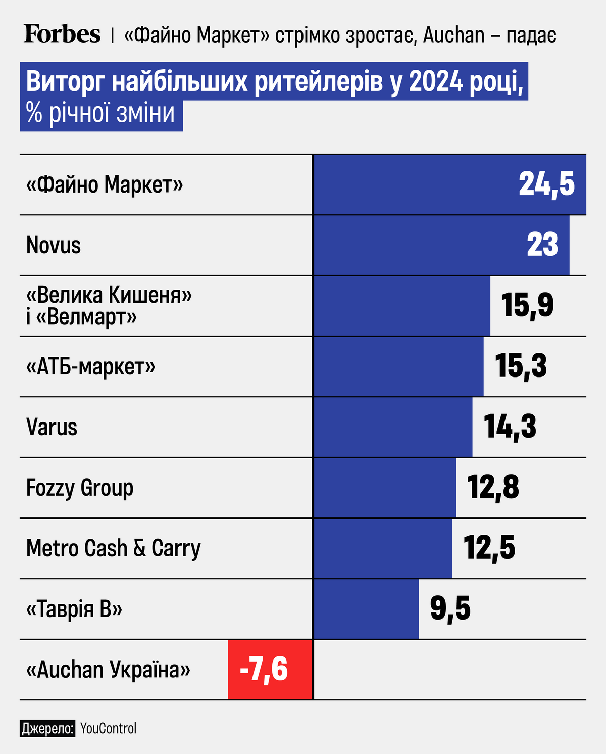 В 2024 году больше выросла выручка у Файно Маркет – на 24,5%, на втором месте Novus с ростом в 23%, но в абсолютных цифрах лидерами по доходам и росту выручки остаются АТБ и Сільпо. Единственное падение показателей зафиксировано в Auchan Украина: выручка этого ритейлера снизилась на 7,6%.
