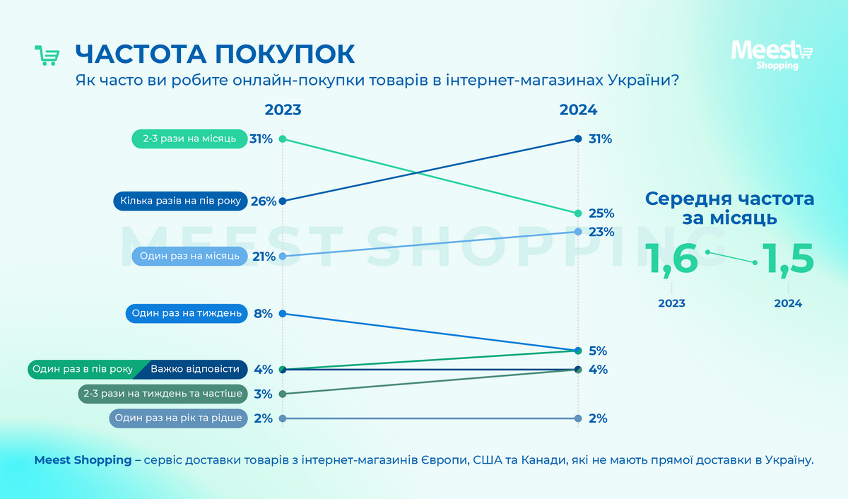 Частота онлайн-покупок остается относительно стабильной по сравнению с прошлым годом. Каждый третий украинец делает заказ несколько раз в полгода, а половина – от одного до трех раз в месяц. В среднем один покупатель совершает 1,5 онлайн-покупки за этот период.
