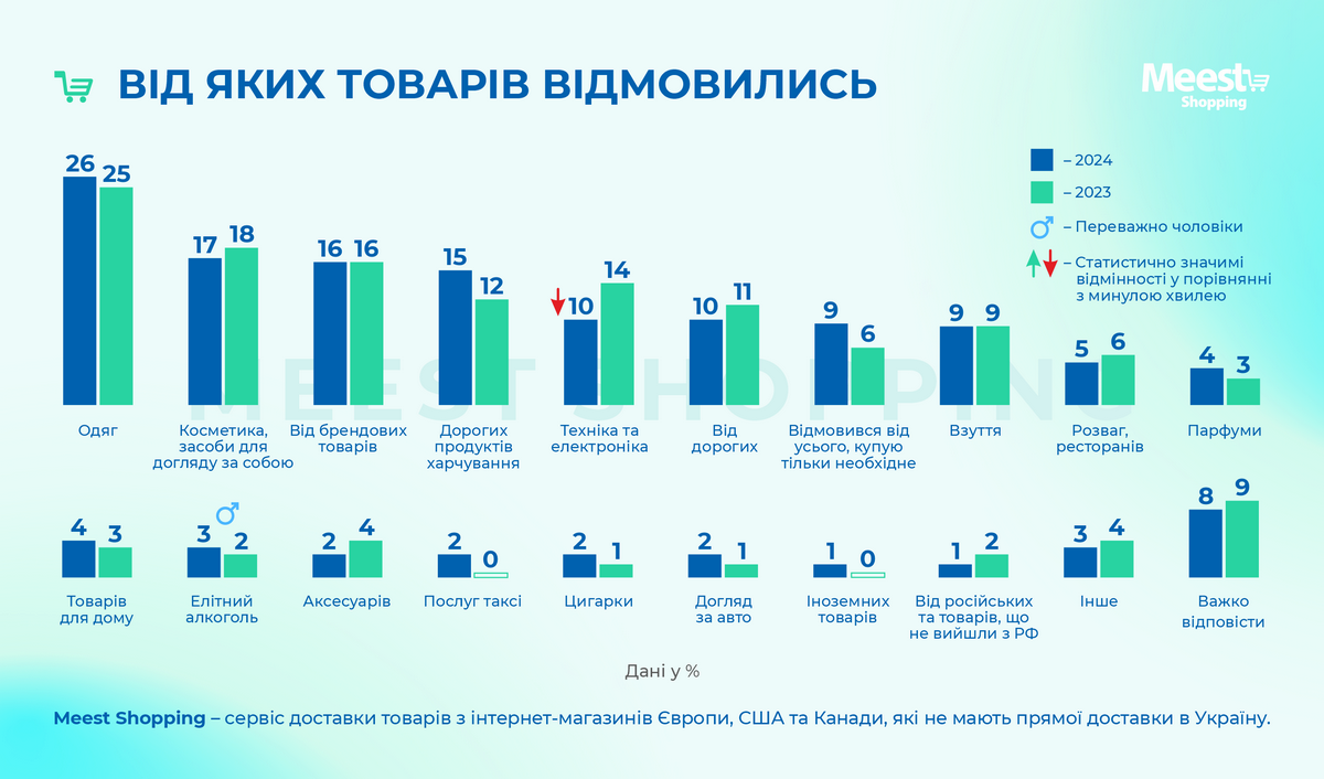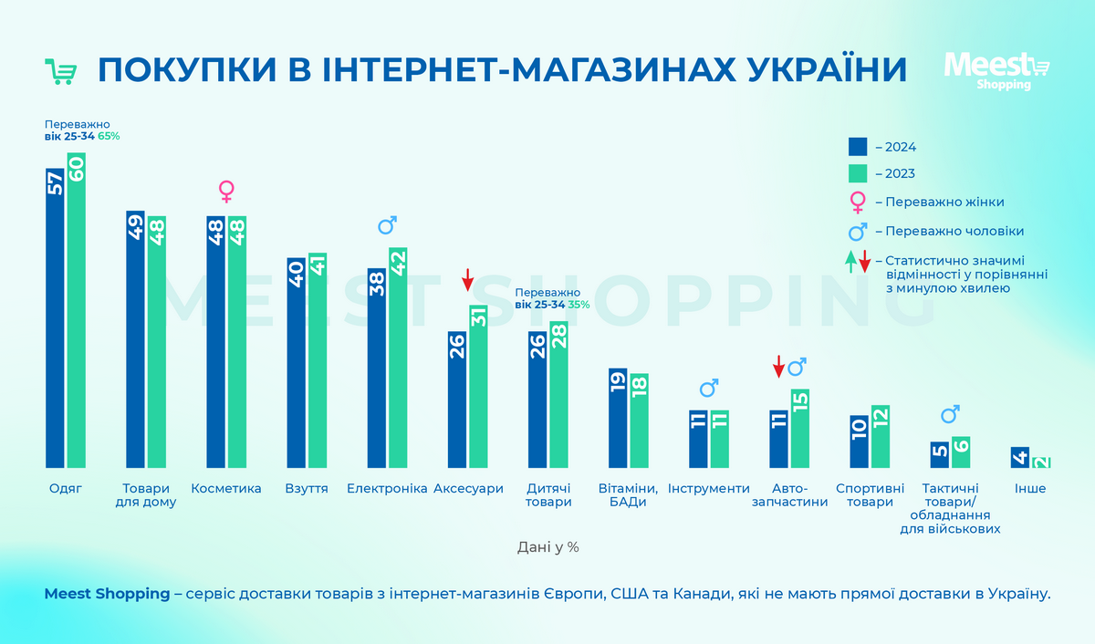 Среди популярнейших категорий товаров остаются одежда, товары для дома, косметика, обувь и электроника. Однако, по сравнению с 2023 годом, украинцы реже заказывали дорогие продукты питания, чаще покупали технику, электронику и косметику.