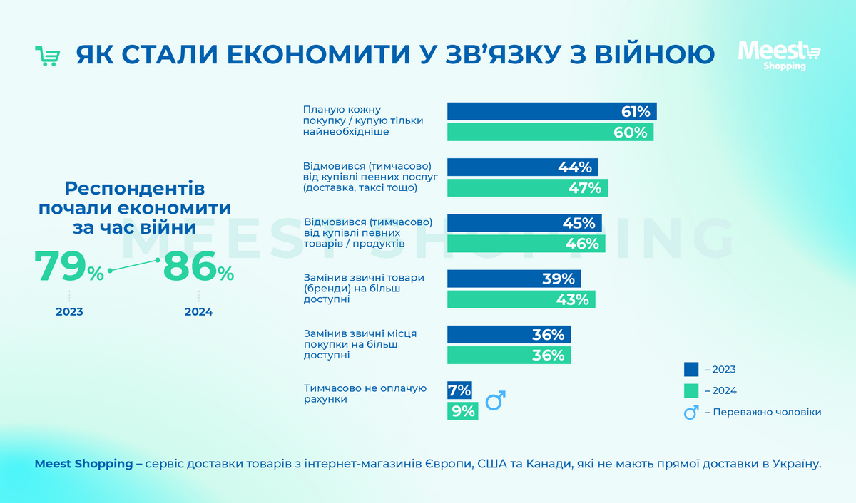 В целом, участники исследования сообщают о снижении собственных финансовых возможностей. У большинства семей хватает денег на еду и иногда на одежду, однако для приобретения бытовой техники, особенно крупной, приходится экономить или одалживать. Более 85% украинцев начали экономить во время войны: многие планируют покупки заранее, временно отказываются от определенных товаров или услуг.
