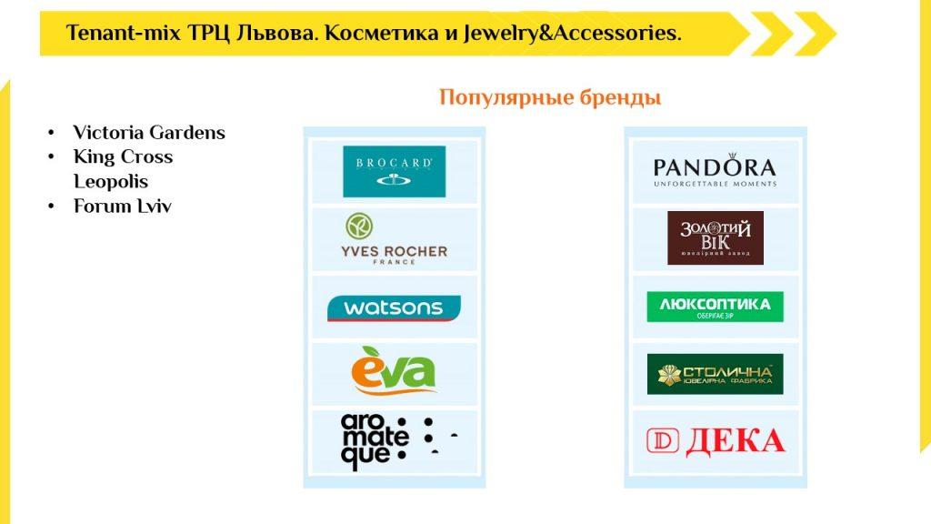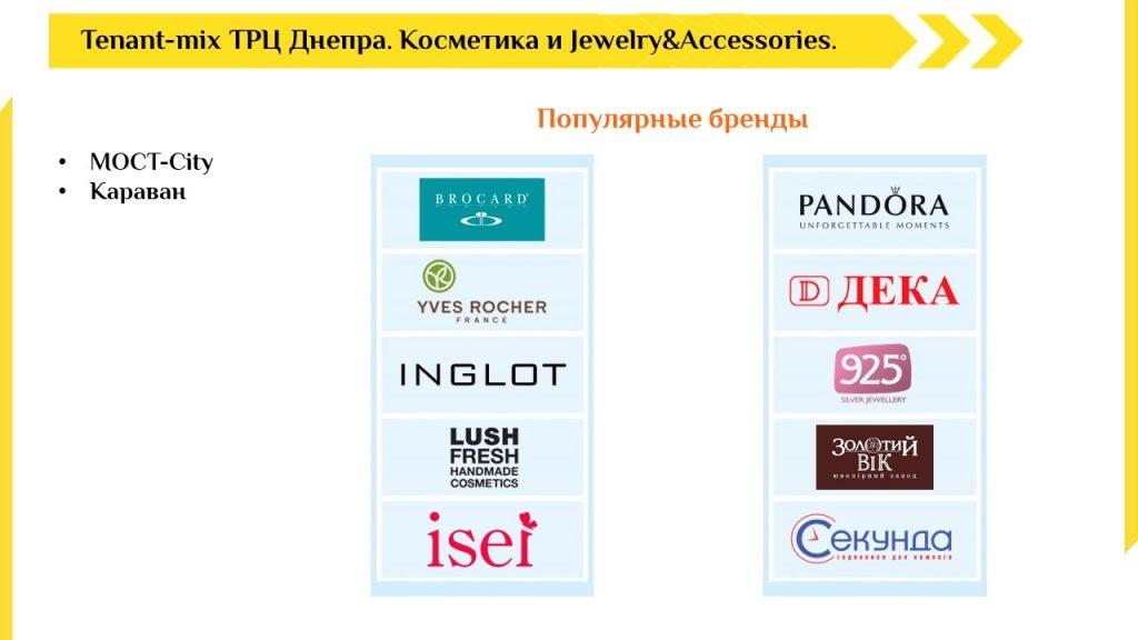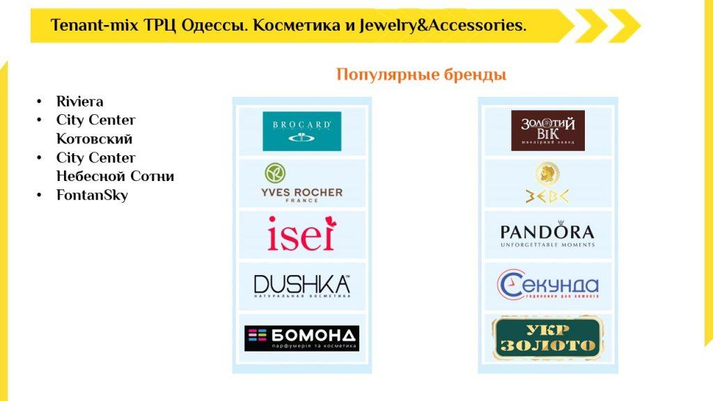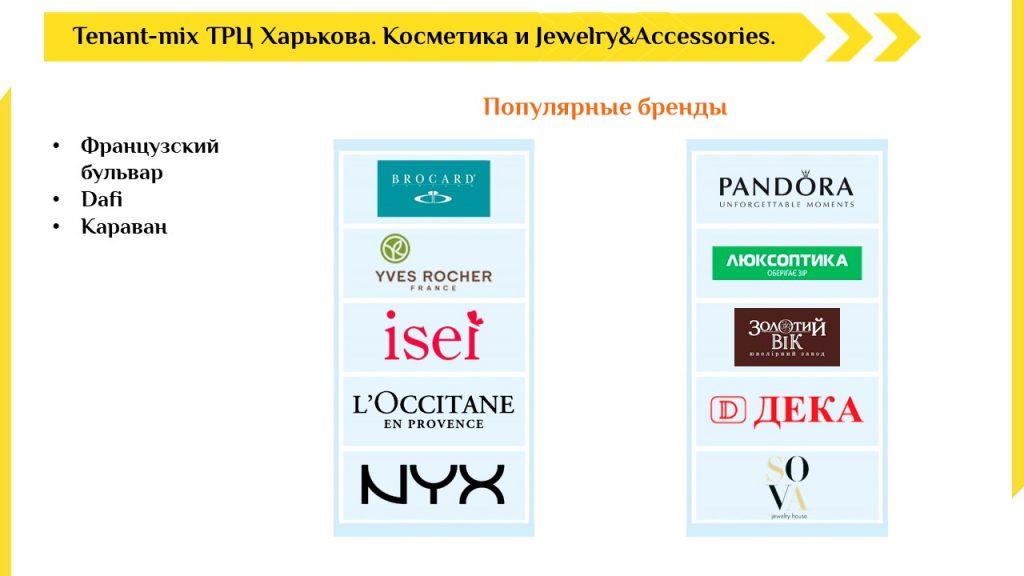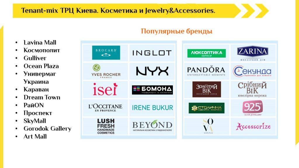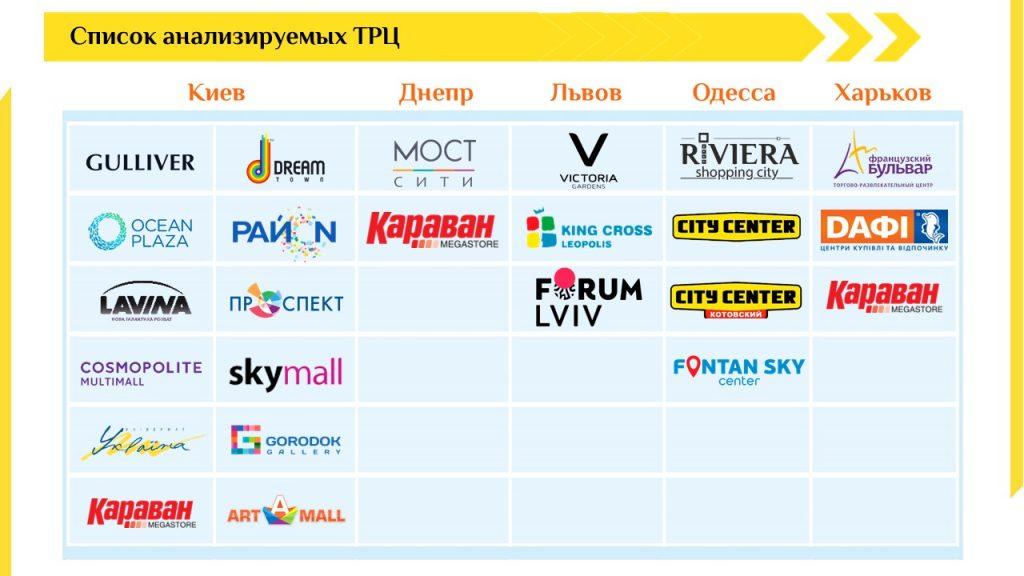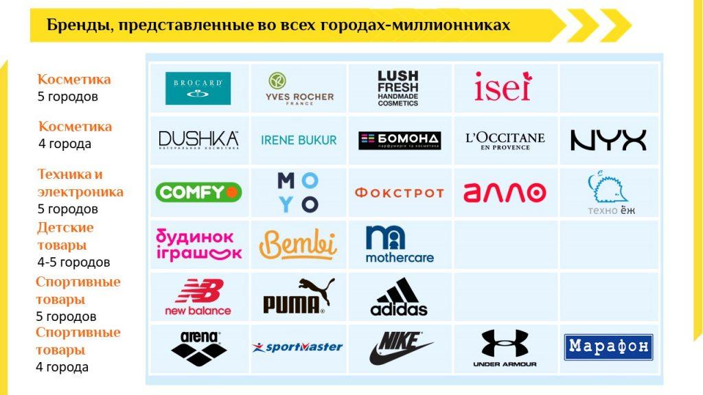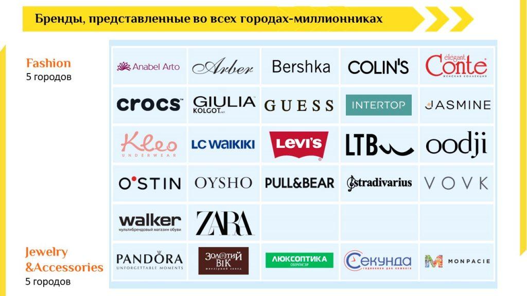 При этом торговых марок, которые присутствуют во всех ключевых ТРЦ городов-миллионников, или хотя бы в большинстве из ниъ, не так уж много. В категории fashion – Anabel Arto, Arber, Bershka, Collin’s, Conte, Crocs, Giulia, Guess, Intertop, Jasmine, Kleo, LC Waikiki, Levi’s, LTB, Oodji, O’Stin, Oysho, Pull&Bear, Stradivarius, Vovk, Walker, Zara. В Jewelry&Accessories – Pandora, Золотой Век, Люксоптика, Секунда, Monpancie. В косметике и парфюмерии – Brocard, Yves Rocher, Lush. В сегменте «техника и электроника» – Comfy, Moyo, Фокстрот, Алло, ТехноЕж. Среди детских товаров: Будинок Іграшок. Из продавцов спортивного снаряжения New Balance, Puma, Adidas.