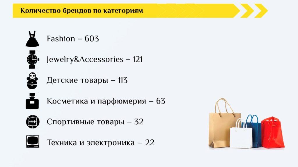 Анализ tenant-mix выбранных ТРЦ выявил более чем солидное количество различных брендов. В категории fashion, например, мы насчитали 603 торговых марки, большинство из которых, разумеется, представлены в единичном экземпляре или же управляют небольшим количеством торговых точек. Другие категории намного менее разнообразны: ювелирные изделия и аксессуары предлагают 121 бренд, детские товары – 113, косметику и парфюмерию – 63, спортивные товары – 32, техника и электроника – 22.