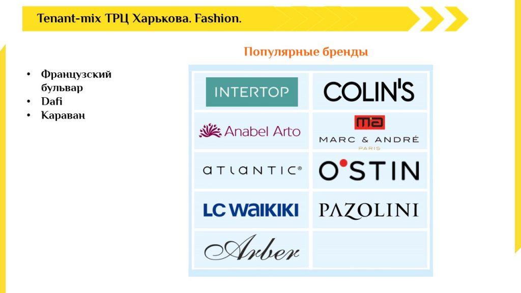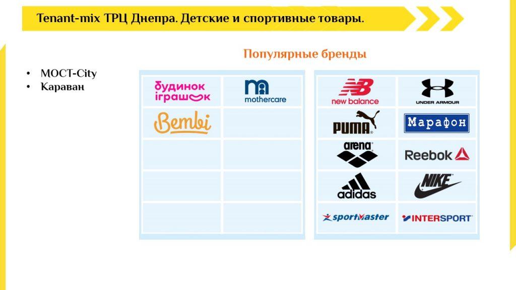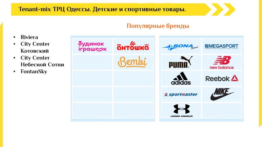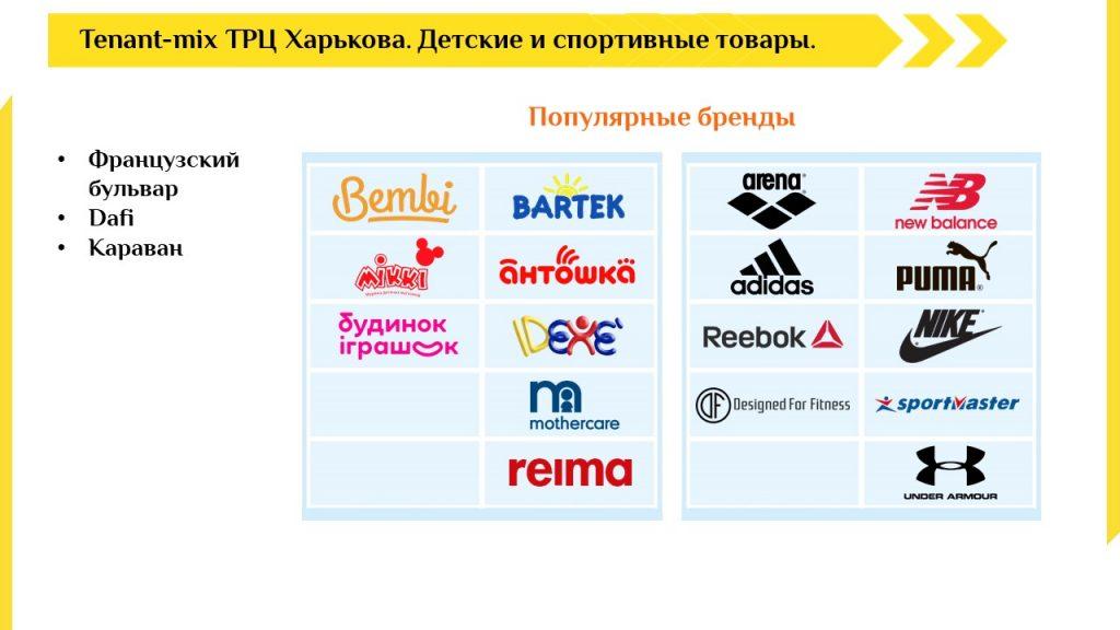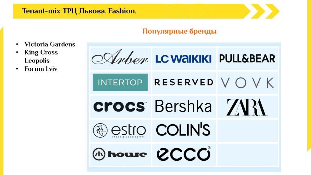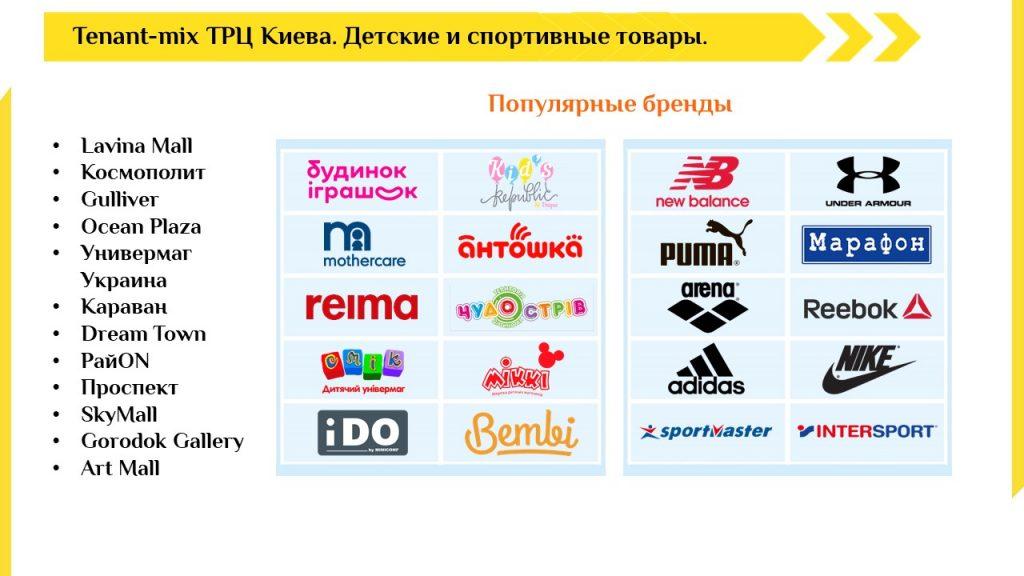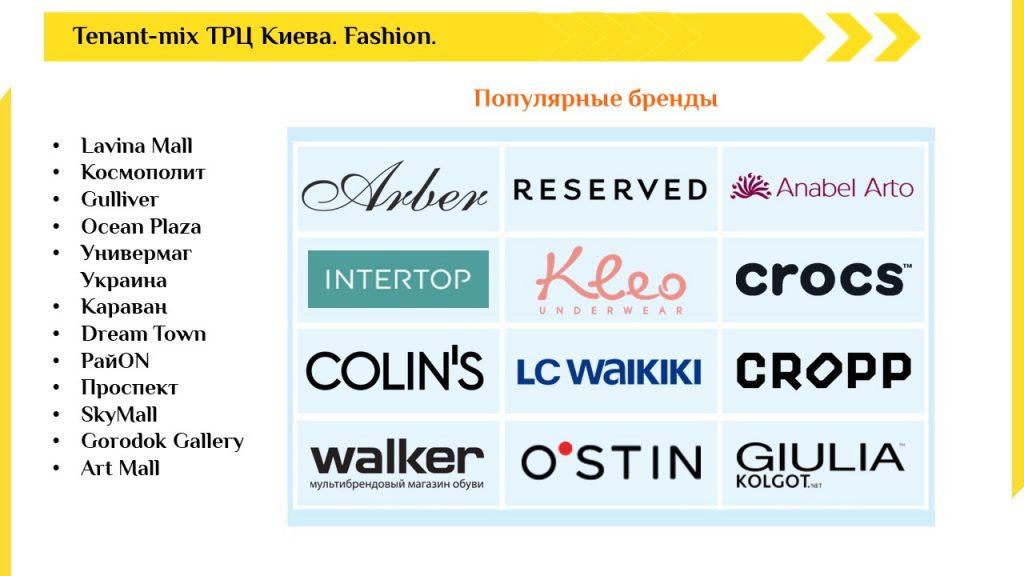 При этом торговых марок, которые присутствуют во всех ключевых ТРЦ городов-миллионников, или хотя бы в большинстве из ниъ, не так уж много. В категории fashion – Anabel Arto, Arber, Bershka, Collin’s, Conte, Crocs, Giulia, Guess, Intertop, Jasmine, Kleo, LC Waikiki, Levi’s, LTB, Oodji, O’Stin, Oysho, Pull&Bear, Stradivarius, Vovk, Walker, Zara. В Jewelry&Accessories – Pandora, Золотой Век, Люксоптика, Секунда, Monpancie. В косметике и парфюмерии – Brocard, Yves Rocher, Lush. В сегменте «техника и электроника» – Comfy, Moyo, Фокстрот, Алло, ТехноЕж. Среди детских товаров: Будинок Іграшок. Из продавцов спортивного снаряжения New Balance, Puma, Adidas.