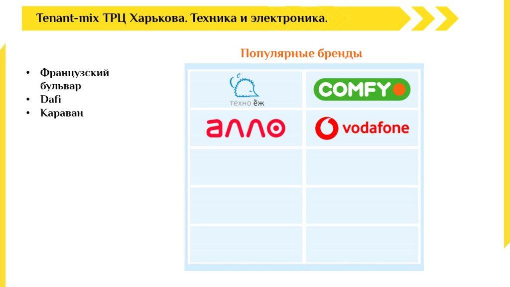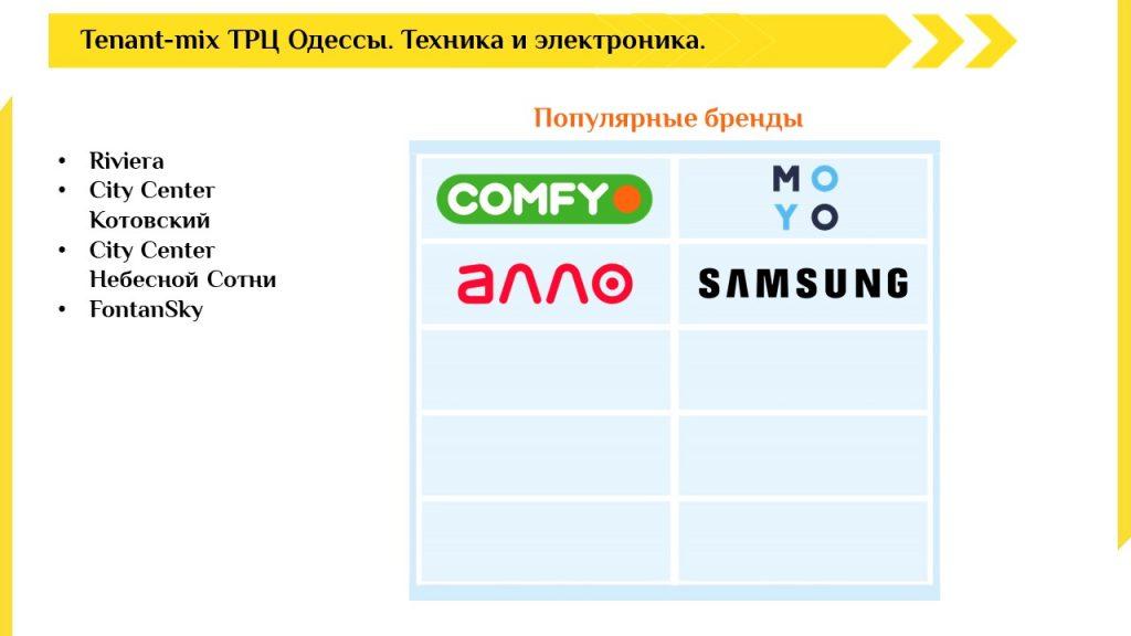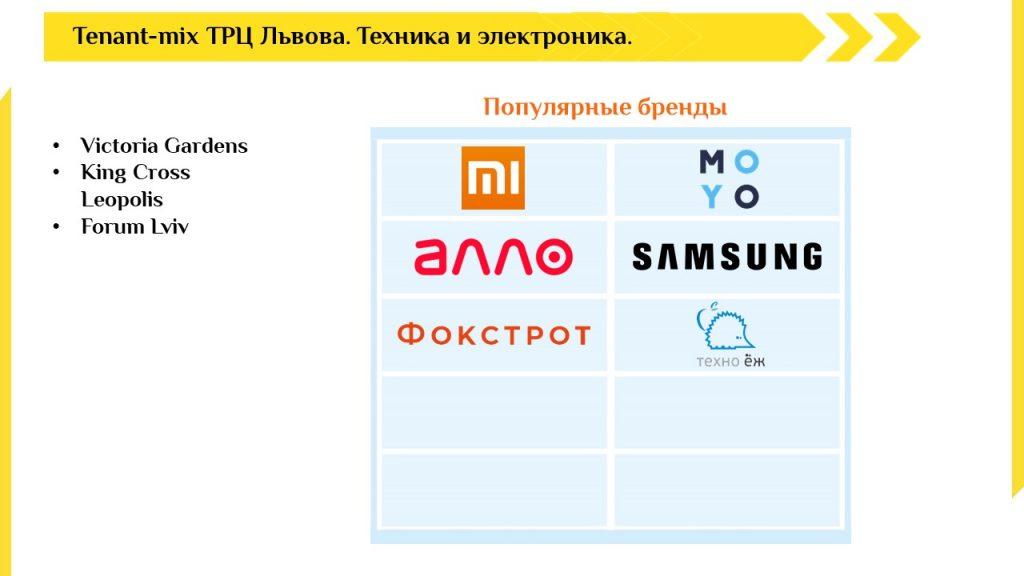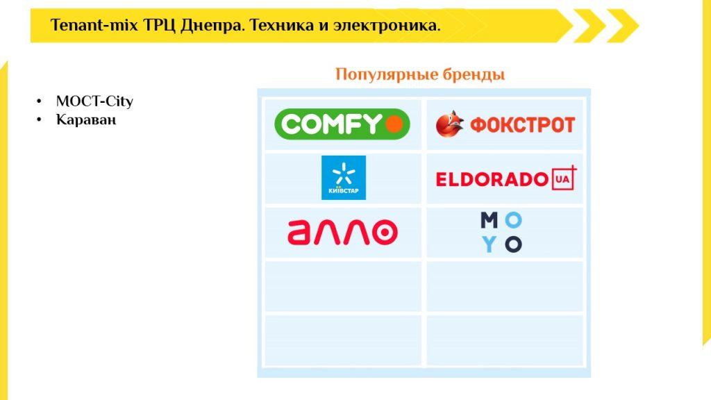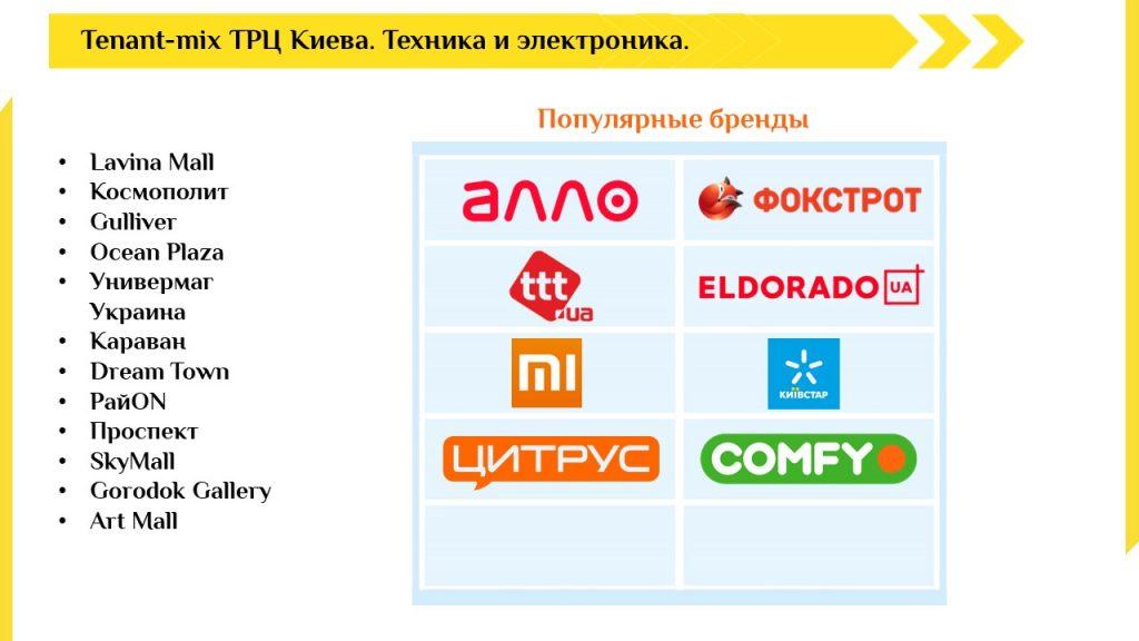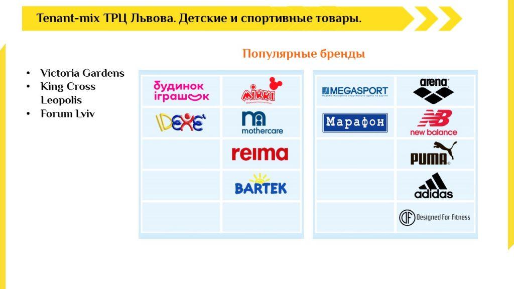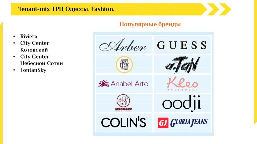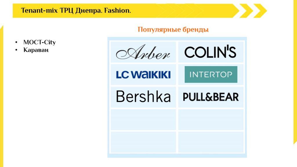 При этом торговых марок, которые присутствуют во всех ключевых ТРЦ городов-миллионников, или хотя бы в большинстве из ниъ, не так уж много. В категории fashion – Anabel Arto, Arber, Bershka, Collin’s, Conte, Crocs, Giulia, Guess, Intertop, Jasmine, Kleo, LC Waikiki, Levi’s, LTB, Oodji, O’Stin, Oysho, Pull&Bear, Stradivarius, Vovk, Walker, Zara. В Jewelry&Accessories – Pandora, Золотой Век, Люксоптика, Секунда, Monpancie. В косметике и парфюмерии – Brocard, Yves Rocher, Lush. В сегменте «техника и электроника» – Comfy, Moyo, Фокстрот, Алло, ТехноЕж. Среди детских товаров: Будинок Іграшок. Из продавцов спортивного снаряжения New Balance, Puma, Adidas.