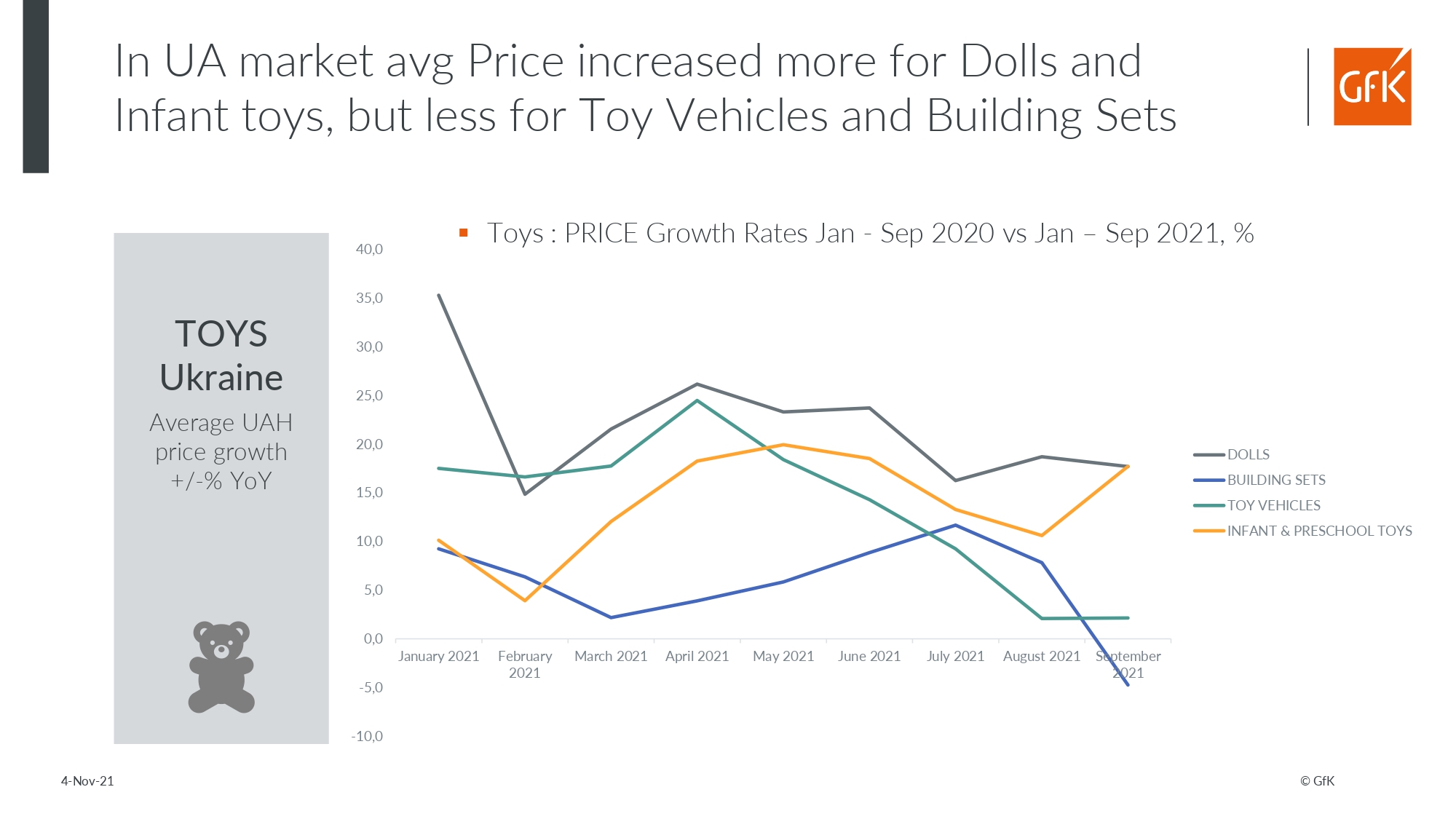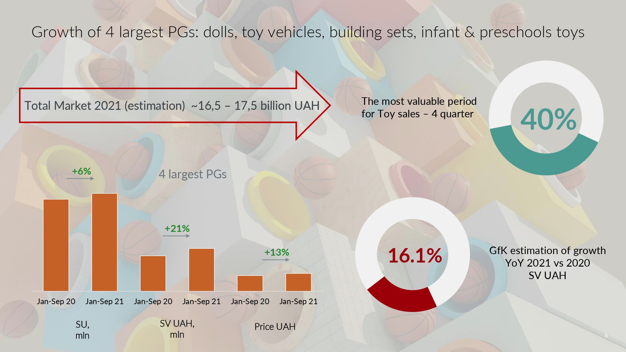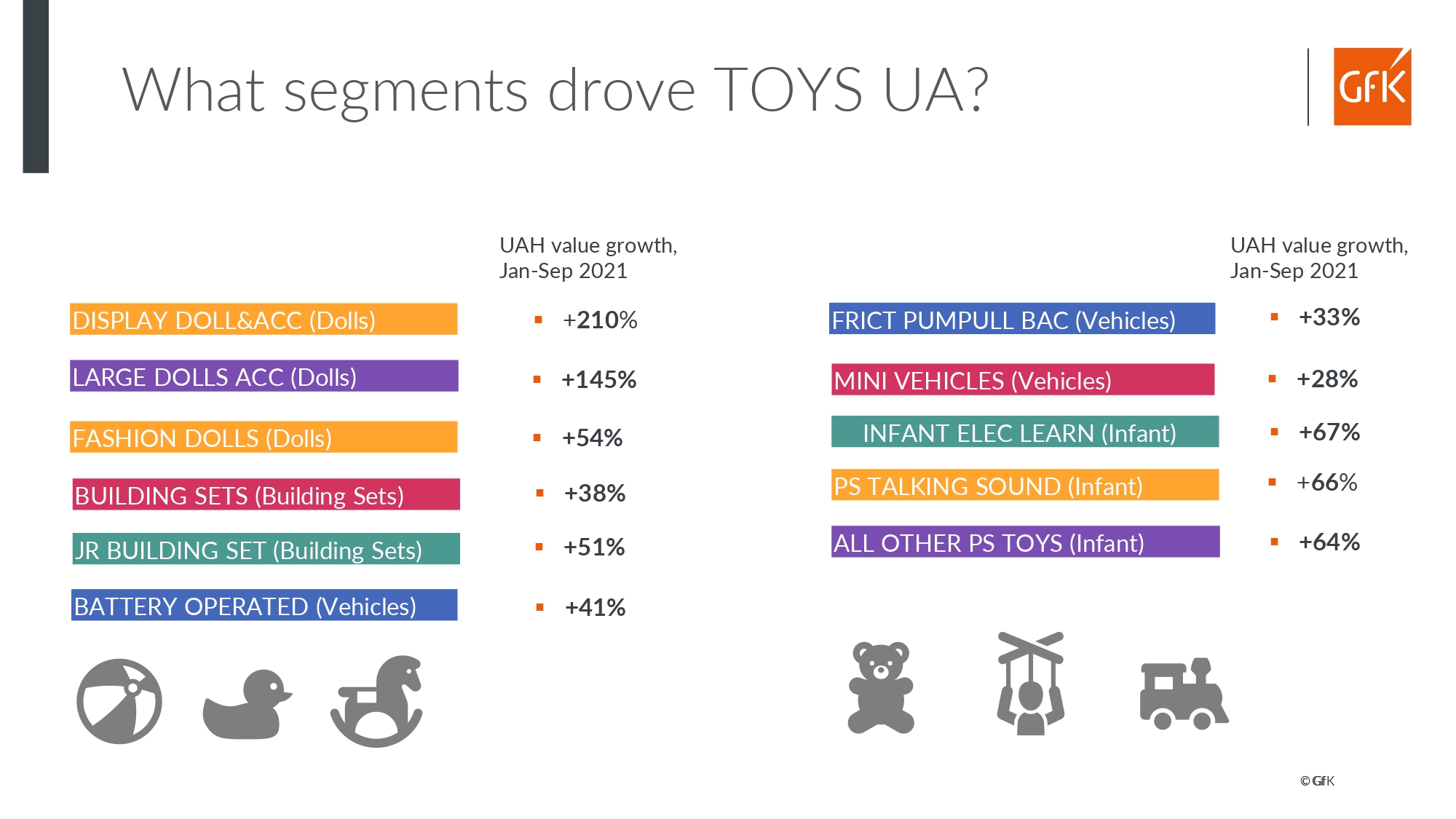 В частности, за 9 месяцев 2021 года количественные объемы рынка игрушек в Украине увеличились на 6%, а финансовые объемы на 21%.