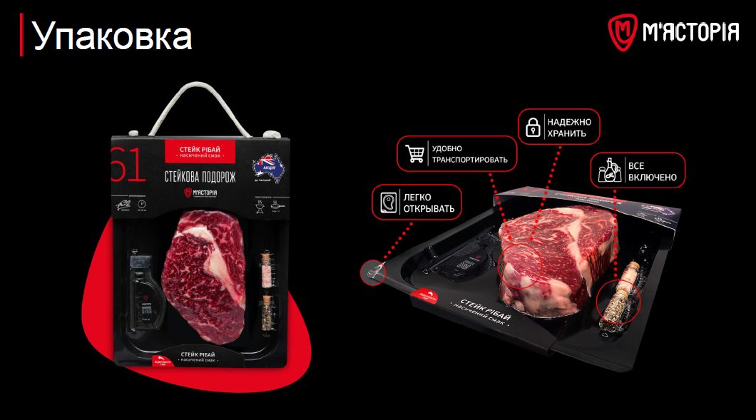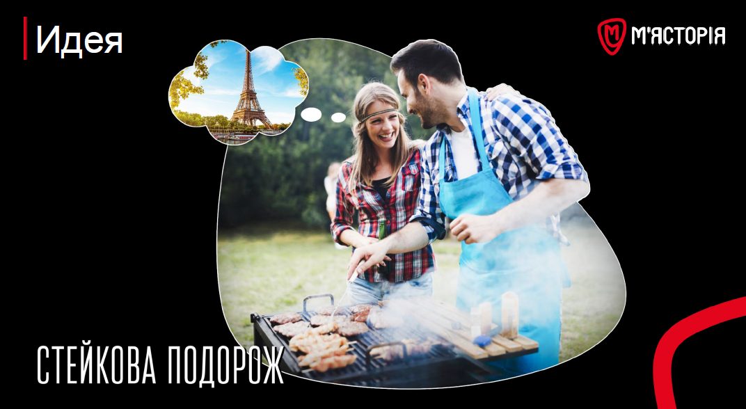 Чтобы выделиться среди конкурентов в ритейле, в М’ясторія взяли линейку самых популярных у покупателей стейков и «привязали» их к конкретным странам (либо по истории происхождения либо по степени популярности в конкретной стране и т.п.). И назвали эту линейку «Стейкова подорож». Чтобы у потребителя возникали сопутствующие эмоции при приготовлении стейков. Например, воспоминания о пребывании в конкретной стране либо мечты о том, как это может быть.