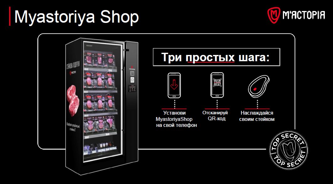 Чтобы купить стейк достаточно загрузить мобильное приложение, авторизоваться через QR-код и забрать товар.