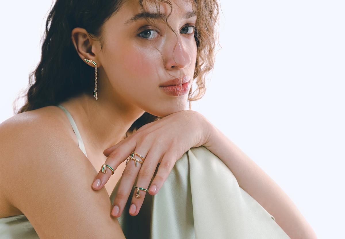 Эти украшения имели небанальный дизайн. Главной героиней этой коллаборации стала ива – это дало нам возможность переосмыслить идею украшений и максимально расширить аудиторию. Продолжая идею фильма – свет преодолеет тьму – наши ювелиры украсили украшения фантазийной изумрудной эмалью, которая способна рассеять тьму, ведь светится в темноте.
