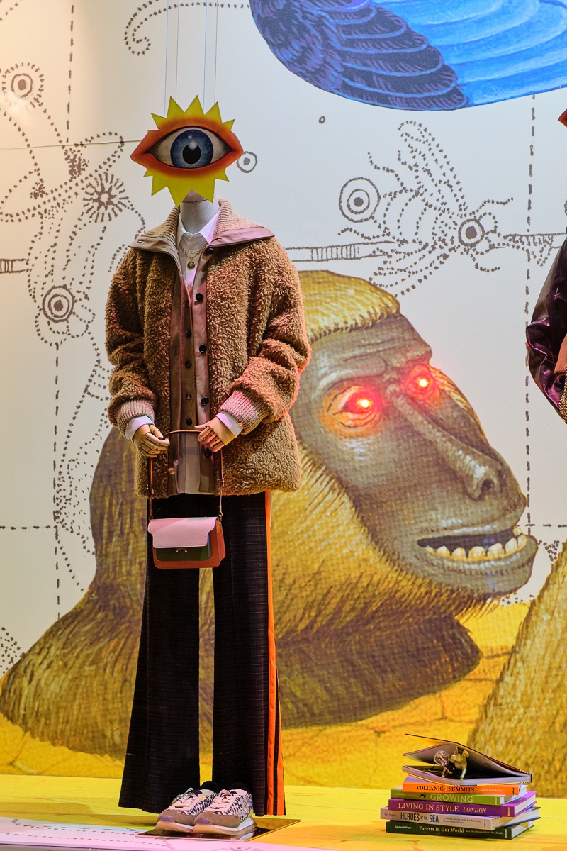 Вместе с креативной командой универмага Владимир Манжос создал уникальное оформление для семи витрин на основе своих ключевых работ и символических изображений. В каждой витрине представлены сюрреалистичные образы, сочетающие в себе мистику и науку: тигр с крыльями, обезьяна со светящимися красными глазами, музыкальные инструменты, игровые и геометрические фигуры. Витрины дополнены объемными арт-объектами и механизированными элементами в формате экранов с мигающим глазом, что также перекликается с творчеством автора. В качестве фона использован паттерн звездного неба, который объединяет все витрины в единую сюжетную композицию.