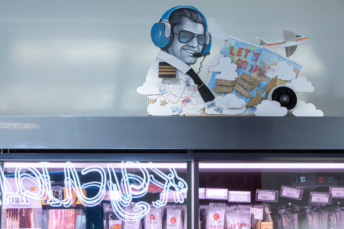 В супермаркете есть двухметровая модель бизнес-джета, от которой тянется неоновая надпись со строками из песни Come Fly With Me, а под потолком можно увидеть марку с Фрэнком Синатрой, выпущенную в 2008 году почтой США в честь великого певца и актера.