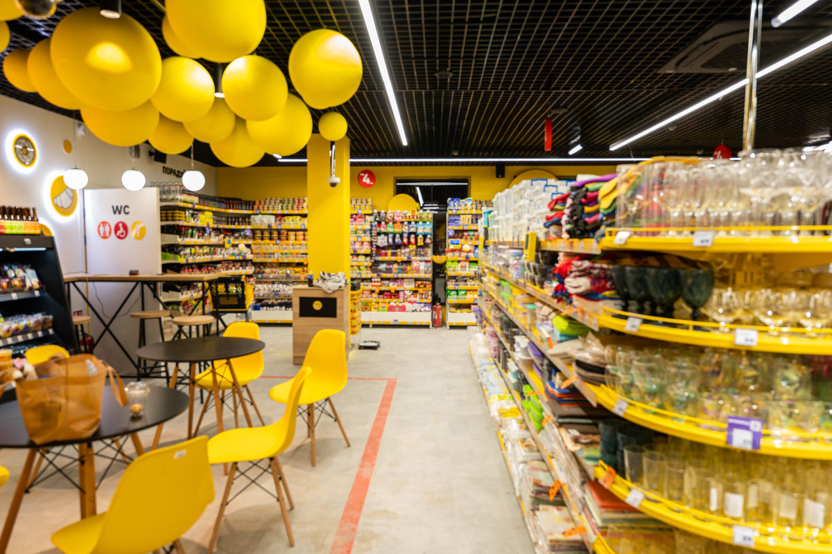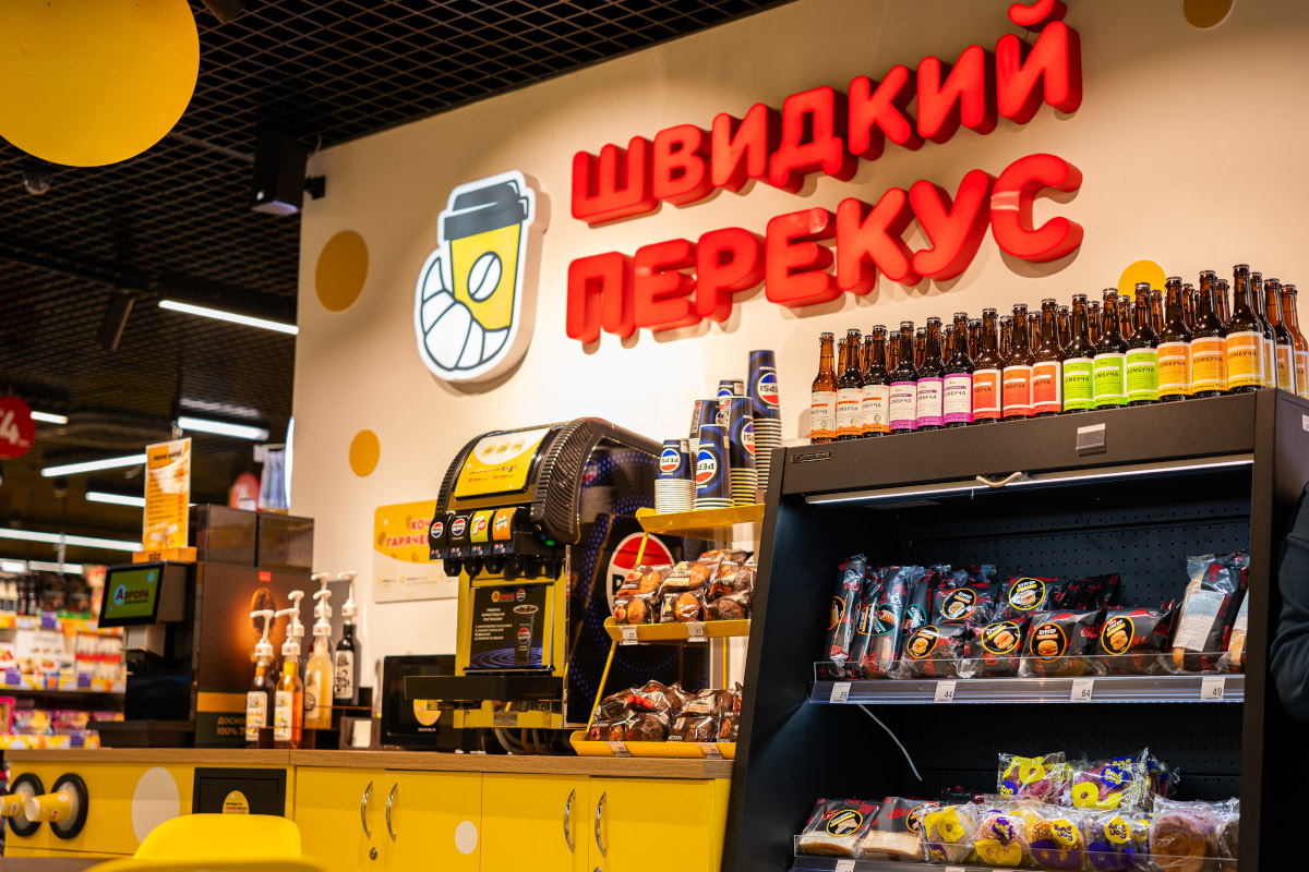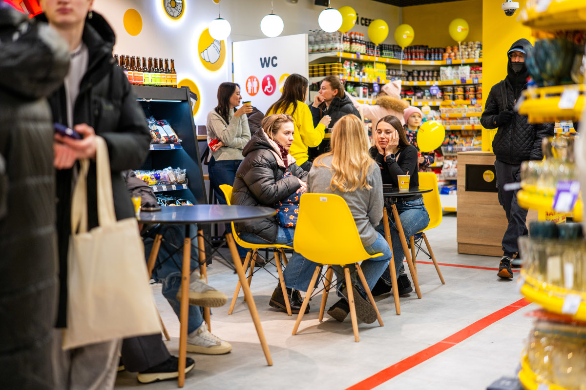 Уникальность магазина заключается в наличии интересных зон, которые можно встретить только в этом формате. К примеру, здесь есть зона быстрого перекуса, где можно приготовить кофе в кофеавтомате и подогреть пищу в микроволновке.