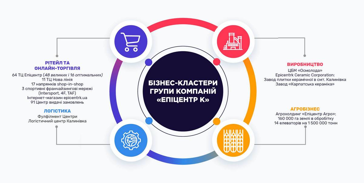 За 17 лет группа компаний Эпицентр К превратилась в мощную бизнес-империю, в которую входят сеть торговых центров Эпицентр, сеть торговых центров Новая линия, онлайн-магазин с собственными центрами выдачи заказов, логистические центры, несколько производственных заводов, агрохолдинг и франчайзинговые спортивные сети.