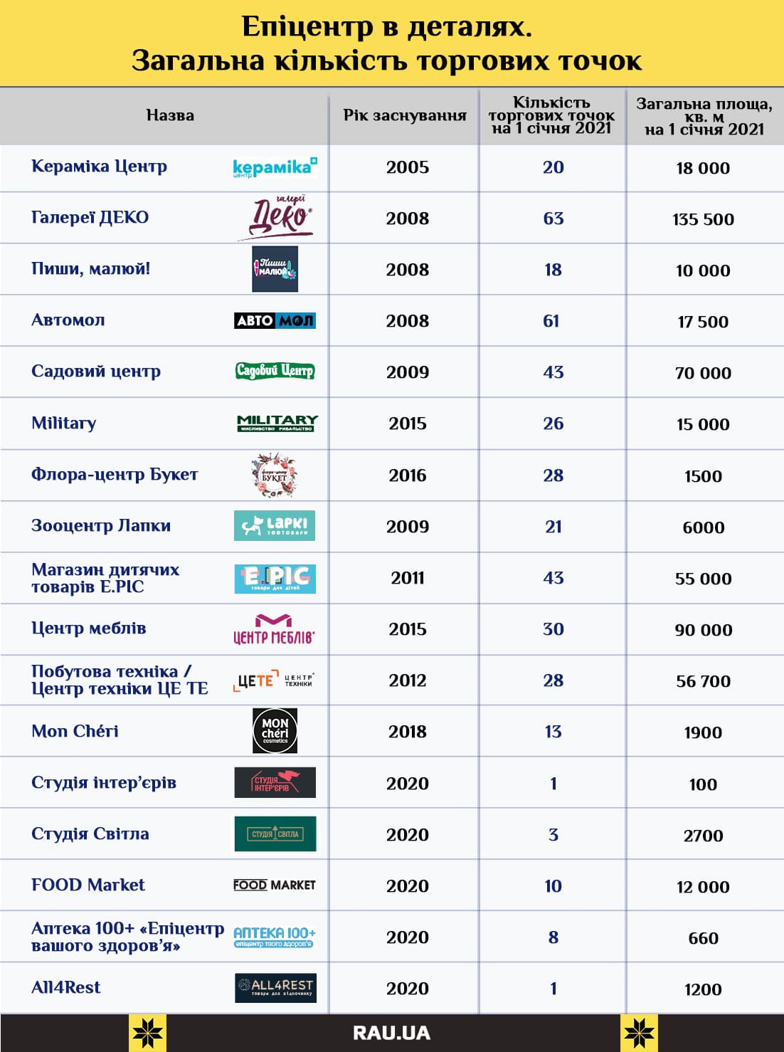 По состоянию на начало года в сети Эпицентр работает 4 магазина формата shop-in-shop в Буче, Львове, Виннице и Запорожье суммарной площадью 172 кв. м. Однако уже в I полугодии 2021-го планируется открыть еще девять точек общей площадью 290 кв. м.