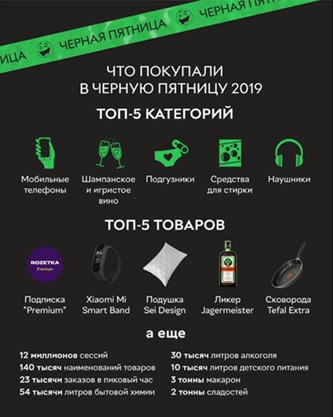 Согласно внутренним данным онлайн-ритейлера, в прошлом году на Черную пятницу сайт продемонстрировал рекордные показатели: 12 млн сессий, 5 млн покупателей и 140 000 проданных наименований товаров. А чаще всего покупали технику, алкоголь и товары сегмента drogerie.
