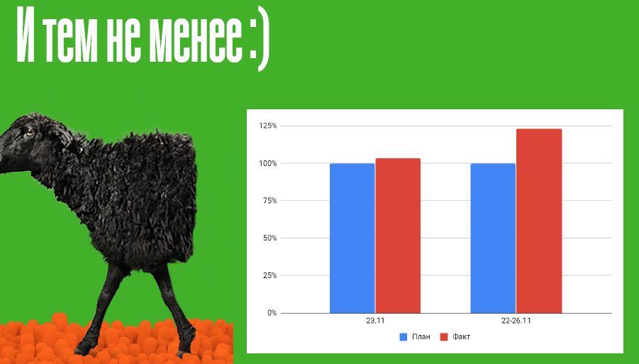 Отмечу, что сотрудники совершили чудо в тот день: они уговаривали клиентов подождать, угощали чаем, убеждали прийти чуть позже и когда в конце концов система “завелась”, ринулись с такой активностью обслуживать клиентов, что план по Black Friday как непосредственно по 23 ноября, так и по всему периоду пиковых продаж, был не просто выполнен, а перевыполнен.