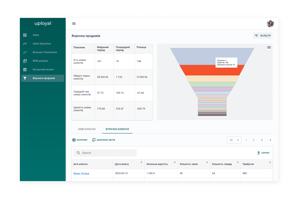 Обширный аналитический блок продукта позволяет оцифровывать гораздо больший объем информации: благодаря интеграции с ERP системами продукт может формировать как общие отчеты по продажам, так и предоставлять персонализированную аналитику по покупателям: в арсенале Uployal есть отчеты по оттоку клиентов, ABC-анализ, RFM-анализ, воронки продаж, рейтинги сотрудников. Все эти отчеты позволяют бизнесу выстраивать более эффективную стратегию.