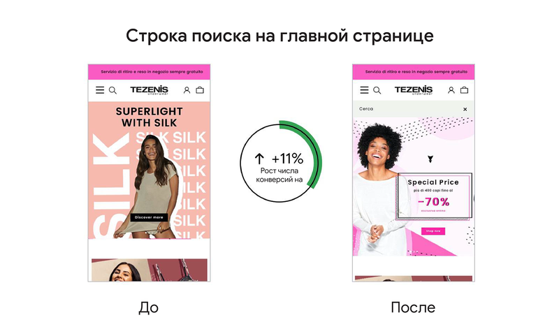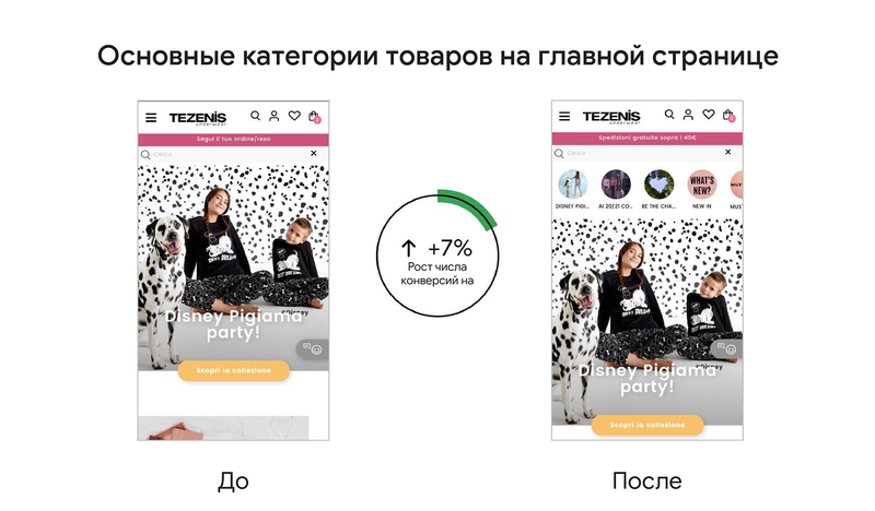 Так покупателям легче находить нужные продукты. Мы увидели рост коэффициента мобильной конверсии и общего дохода с продаж. Для сайтов Calzedonia наши специалисты выбрали самые популярные категории товаров на основе данных Google Аналитики. Это позволило получать еще больше конверсий. Мы добавили основные категории товаров на главную страницу итальянского сайта Tezenis, и коэффициент конверсии вырос на 8%, а количество конверсий — на 7%.