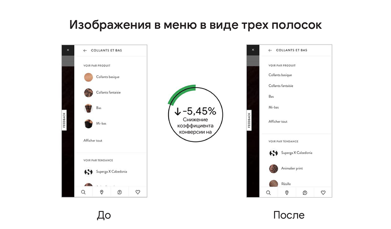 Картинки в привычном меню с тремя горизонтальными полосками помогают посетителям сориентироваться и сделать покупку. Тесты на сайтах разных брендов показали, что этот прием облегчает навигацию и помогает повысить коэффициент конверсии. Когда мы убрали изображения из меню на сайте Calzedonia, коэффициент конверсии упал на 5,45%.