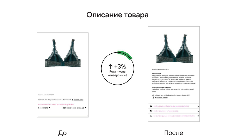 На сайте Tezenis фотографии товара занимали большую часть страницы, а описание можно было посмотреть только при нажатии кнопки. Тестирование показало: если пользователь всегда видит описание товара, это положительно влияет на конверсии. В нашем случае они выросли на 3%.